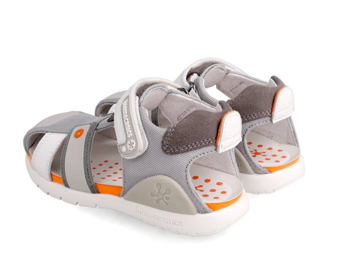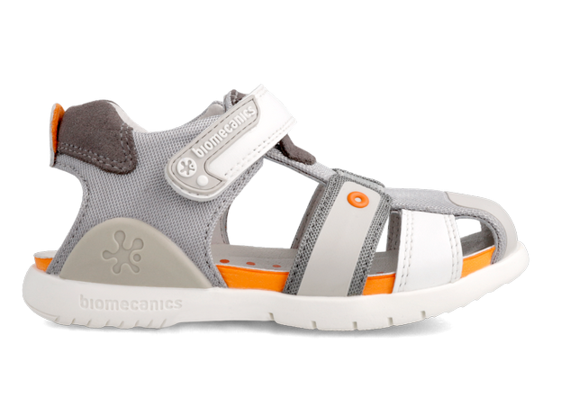 Παιδικό δερμάτινο παπουτσοπέδιλο σε χρώμα γκρι, με λευκές & πορτοκαλί λεπτομέρειες.
