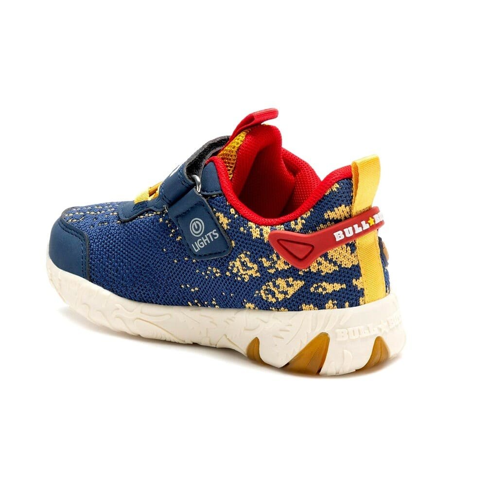 Αγορίστικα αθλητικά με ΦΩΤΑΚΙΑ στη σόλα, σε μπλε χρώμα, με κόκκινες & κίτρινες λεπτομέρειες και σχέδιο δεινόσαυρο Αγκυλόσαυρο.