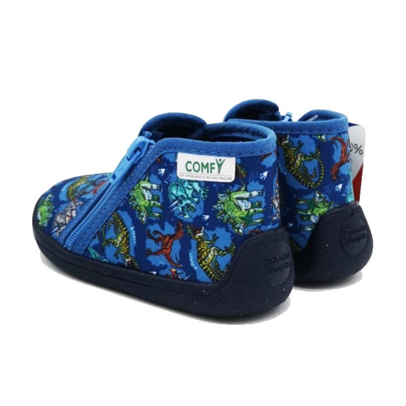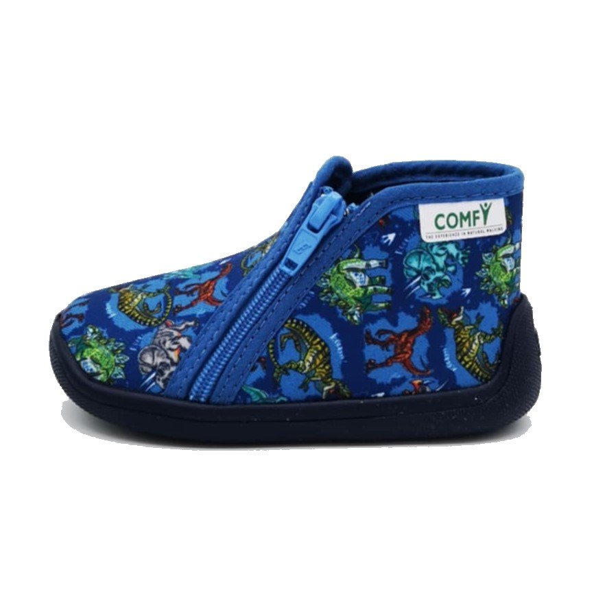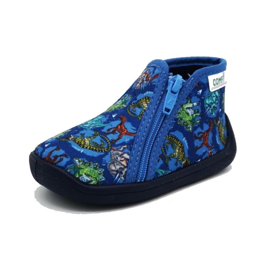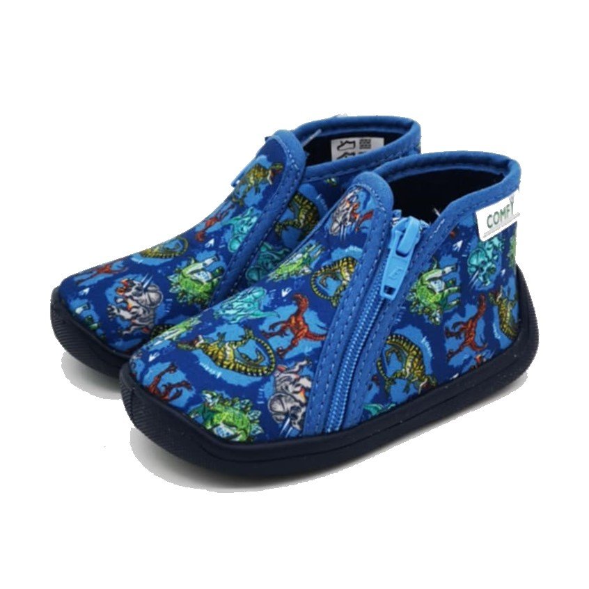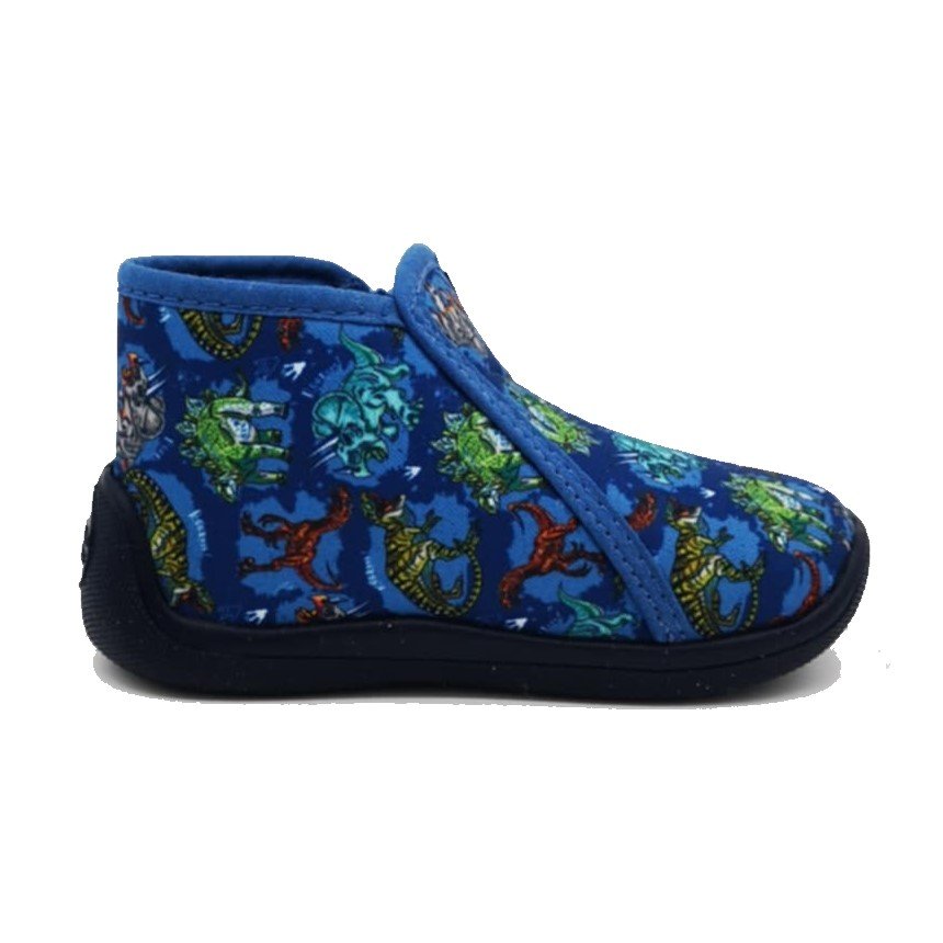 Αγορίστικα παντοφλάκια, τύπου μποτάκι, σε μπλε ρουά χρώμα με σχέδιο πολύχρωμα δεινοσαυράκια.