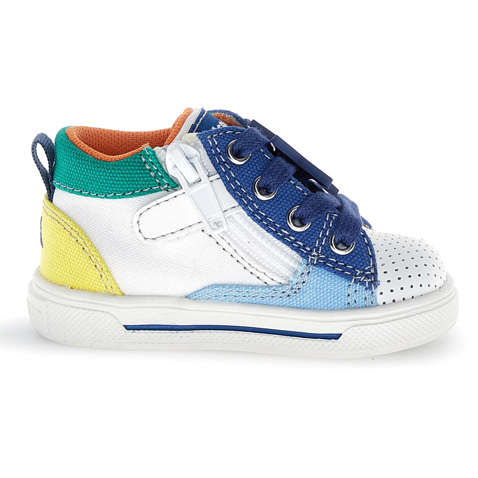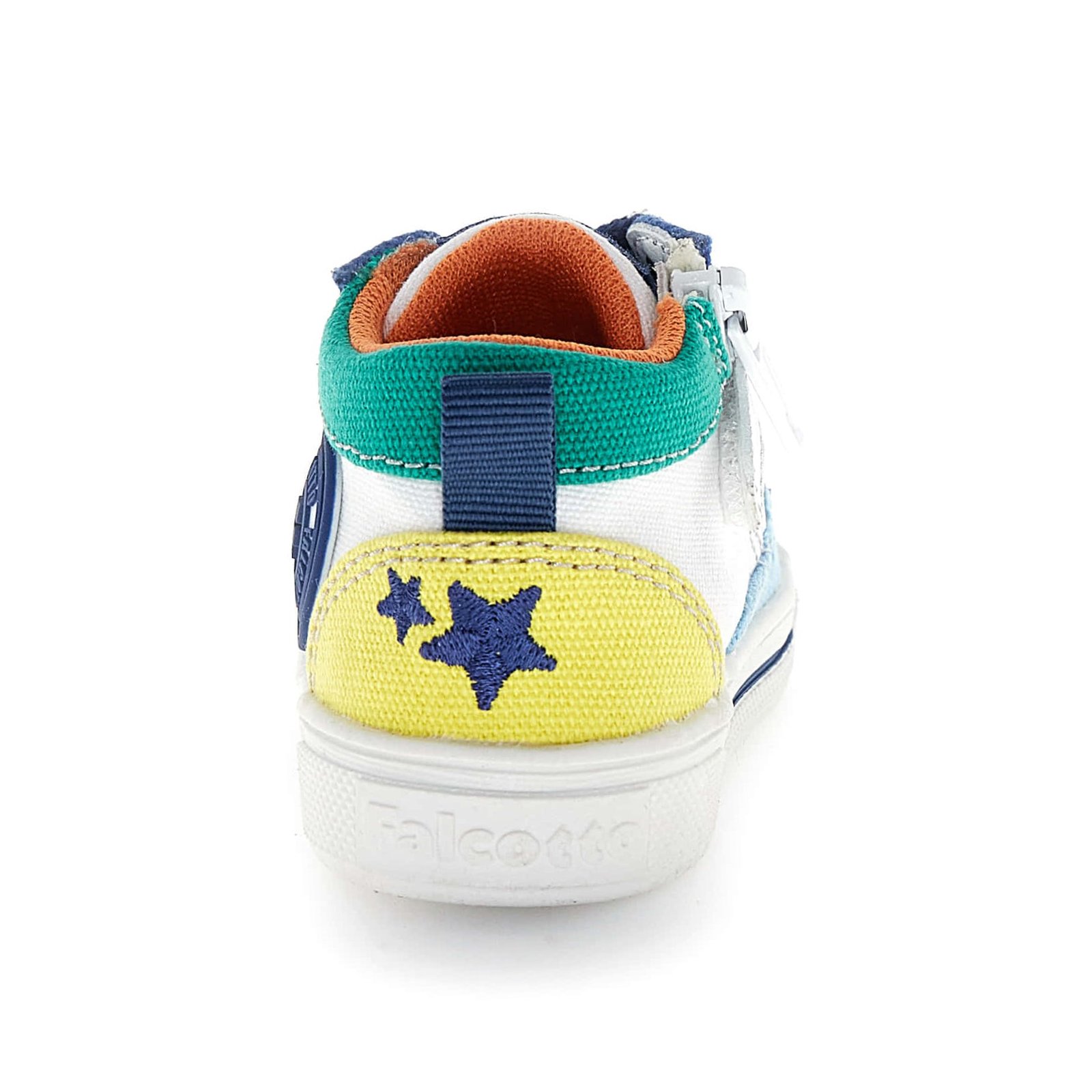 Παιδικά ανατομικά μποτάκια, σε στυλ σταράκια, σε λευκή βάση με λεπτομέρειες σε μπλε-πράσινο-κίτρινο & απλικέ σχέδιο αστέρι στα κορδόνια.