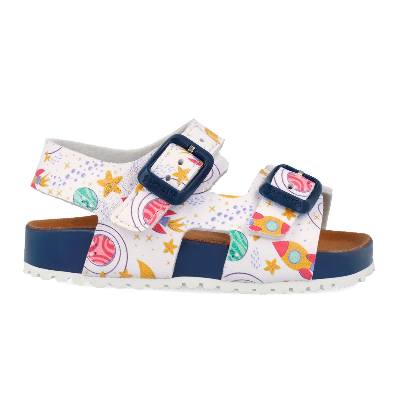 Παιδικά πέδιλα με ανατομικό πέλμα, τύπου σκαφάκι, σε λευκό χρώμα με διαστημικό σχέδιο.