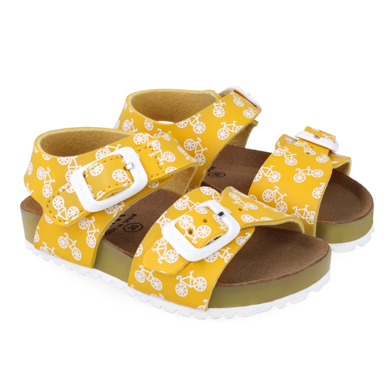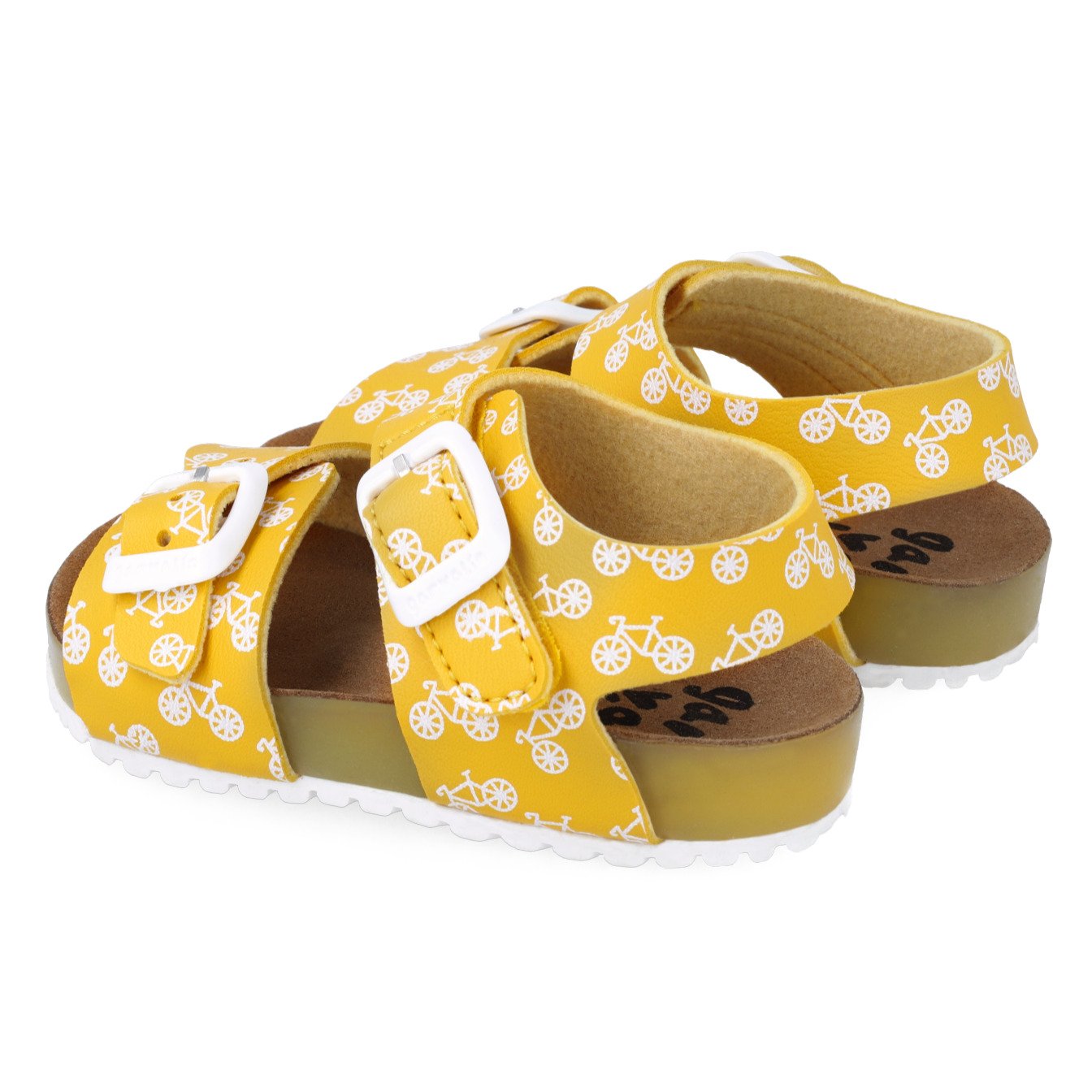 Παιδικά πέδιλα με ανατομικό πέλμα, τύπου σκαφάκι, σε κίτρινο χρώμα με σχέδιο λευκά ποδηλατάκια.