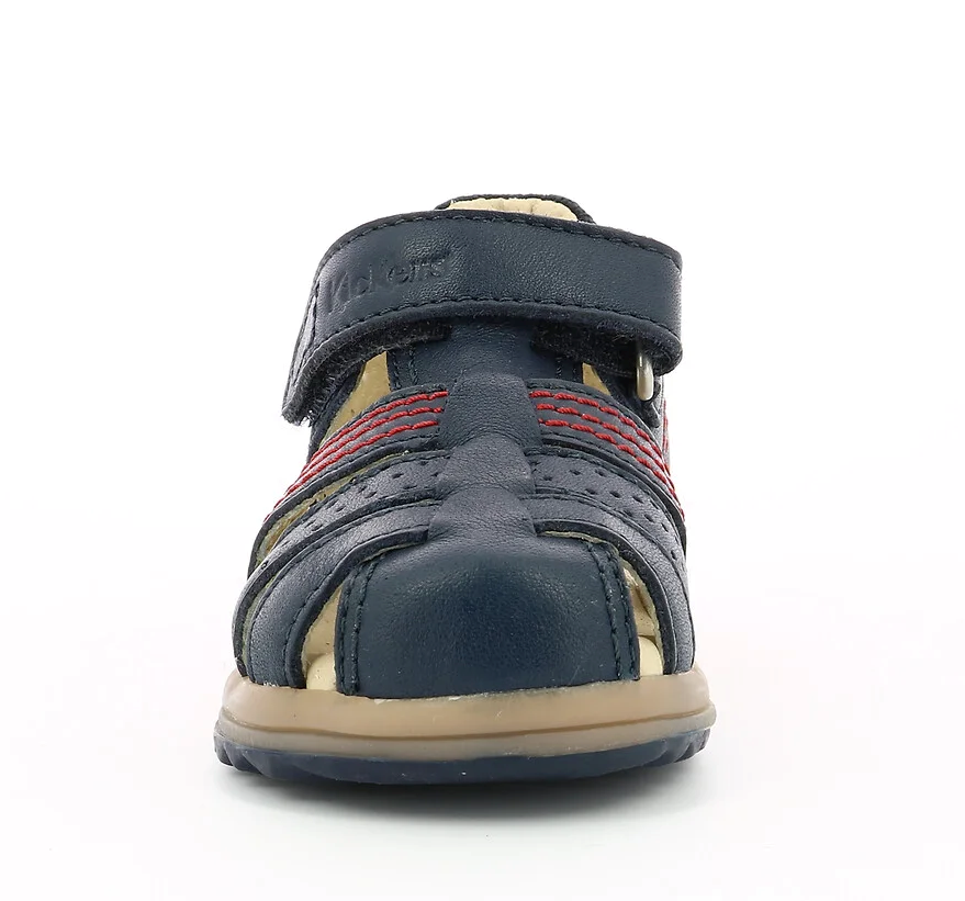 Παιδικά δερμάτινα παπουτσοπέδιλα, σε σκούρο μπλε χρώμα, με κόκκινα γαζιά.