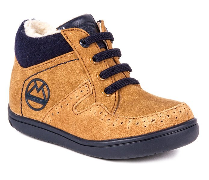 Παιδικά μποτάκια σε στυλ sneakers σε καφέ κάμελ χρώμα με μπλε λεπτομέρειες.Εξωτερικά συνδυασμός δέρμα και τεχνόδερμα και εσωτερικά επένδυση γούνα και ύφασμα.Διαθέτουν δερμάτινο,ανατομικό,αντιμικροβιακό πέλμα.Η σόλα είναι κατασκευασμένη από λάστιχο,ώστε να είναι εύκαμπτη,μαλακή και αντιολισθητική.Κλείσιμο με φερμουάρ εσωτερικά και διακοσμητικά ελαστικά κορδόνια για εύκολη εφαρμογή και σταθερά βήματα.
