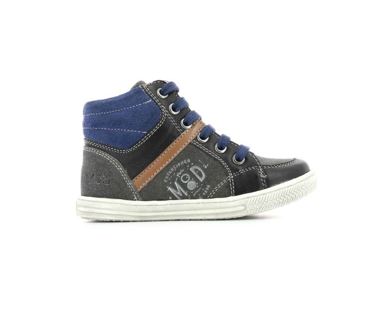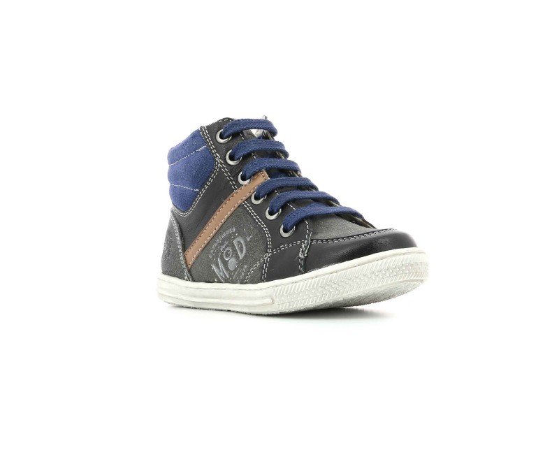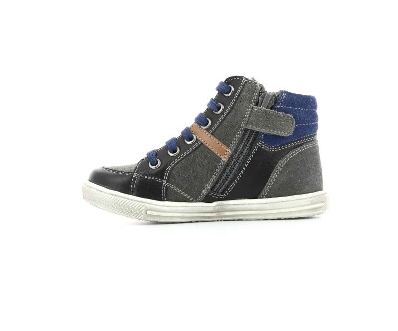 Παιδικά ψηλά μποτάκια σε γκρι και μπλε χρώμα.Δερμάτινα εξωτερικά και εσωτερικά,με ανατομικό πέλμα και μαλακή σόλα.Κλείσιμο με κορδόνι,φερμουάρ και velcro.