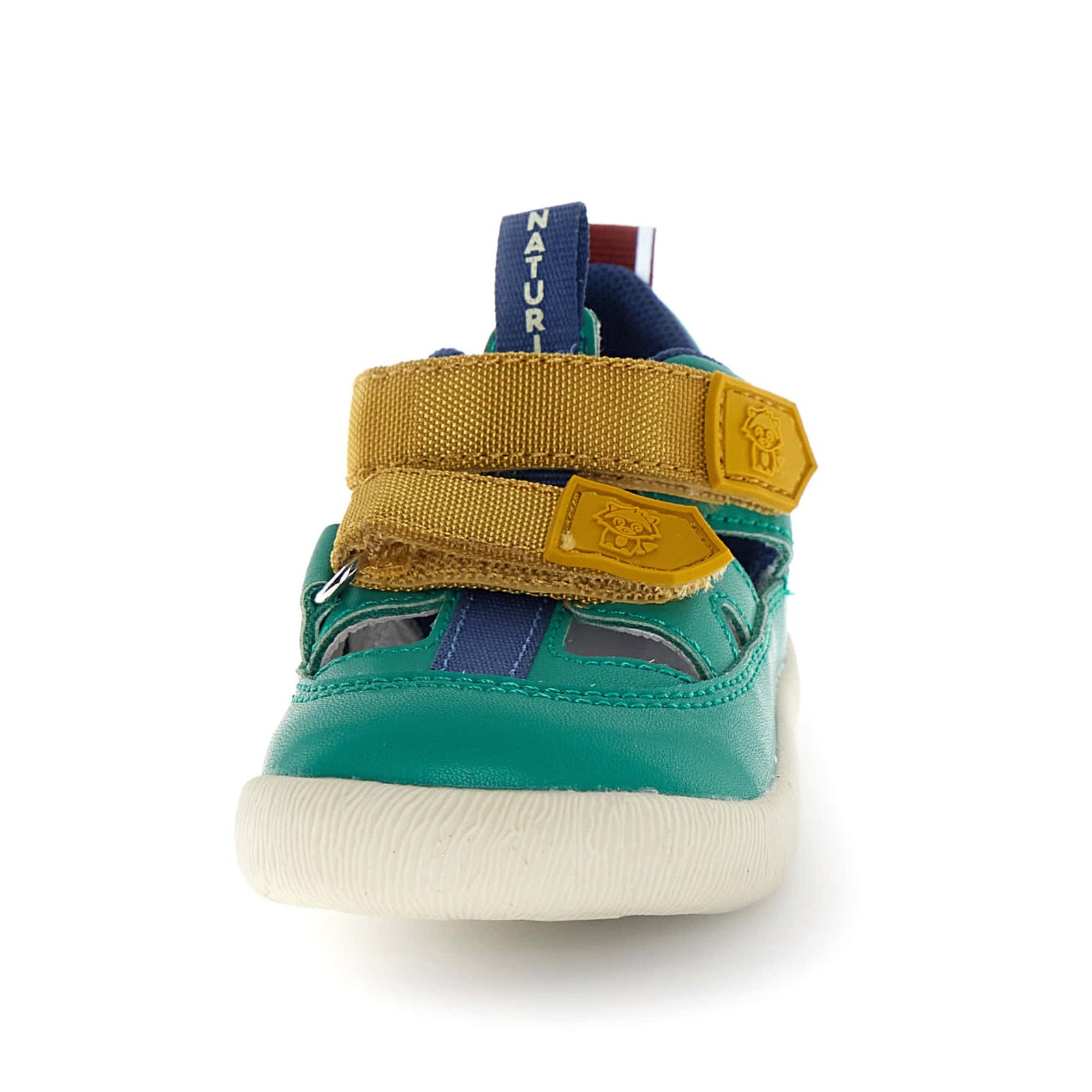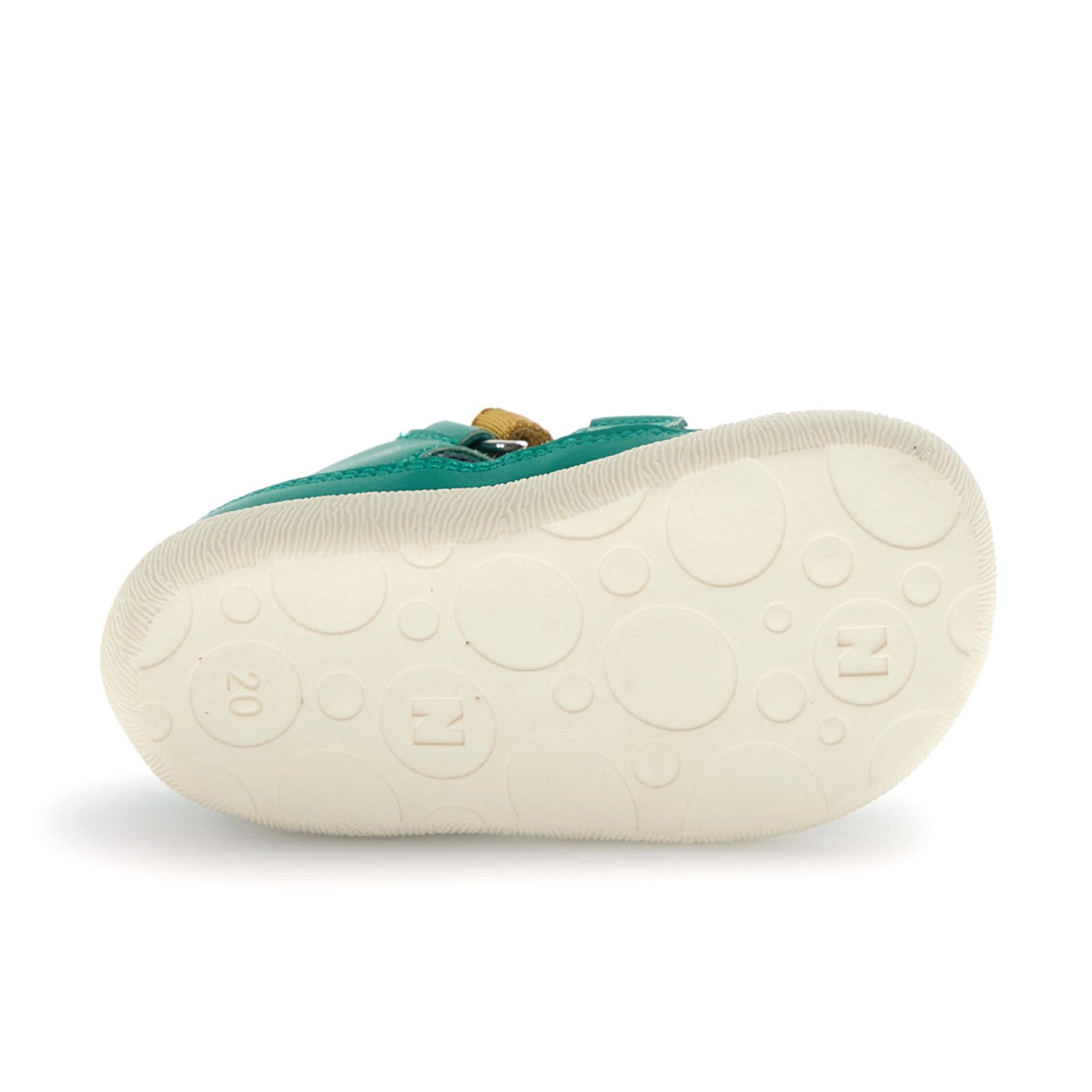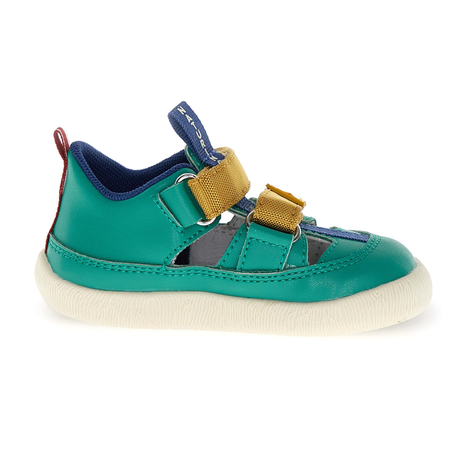 Παιδικά δερμάτινα παπουτσοπέδιλα σε πράσινο χρώμα, με μουσταρδί λεπτομέρεια.