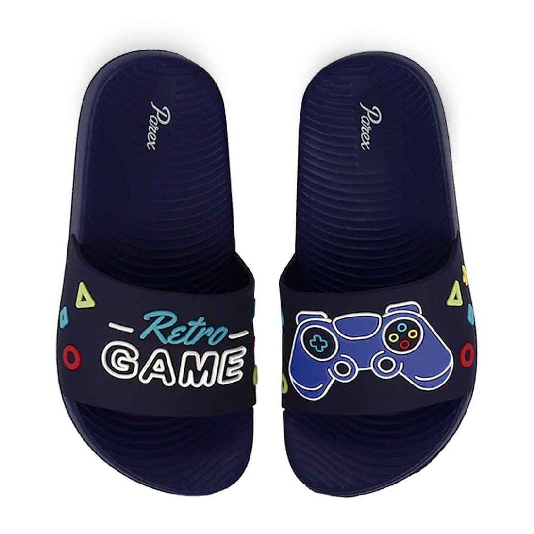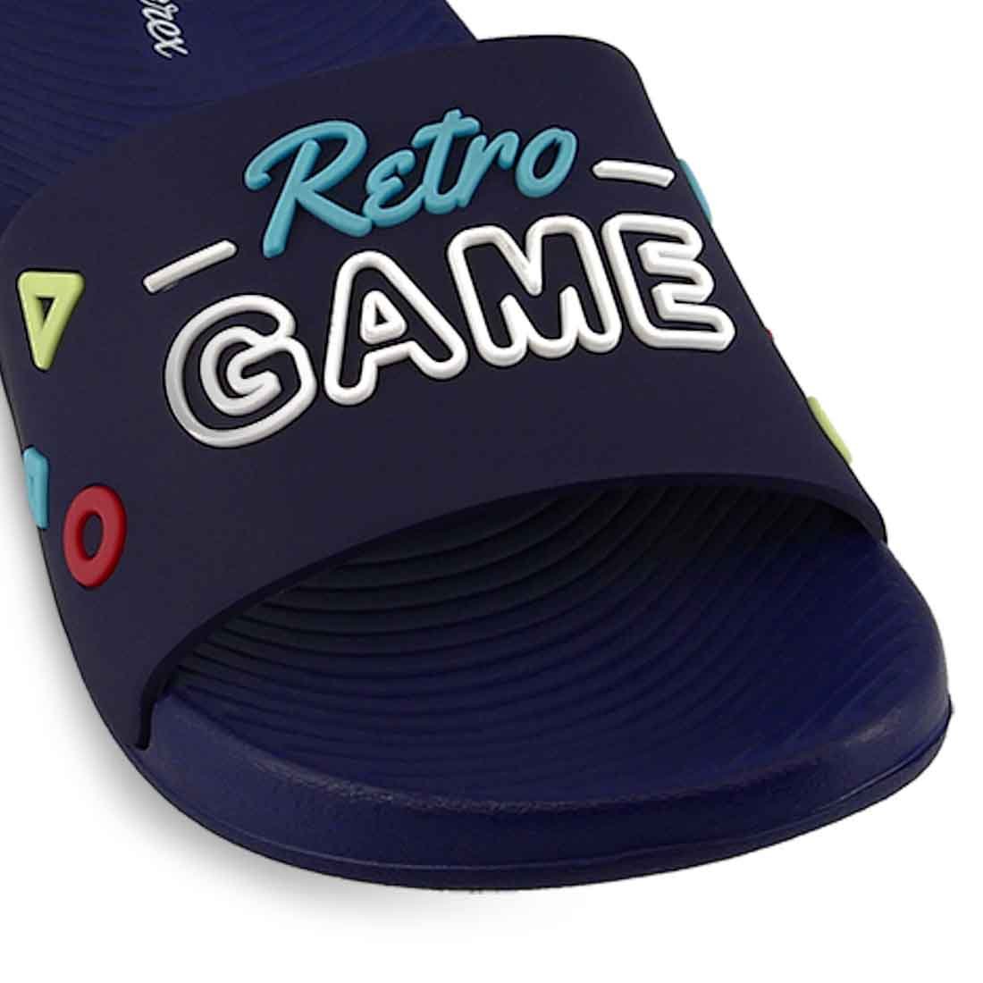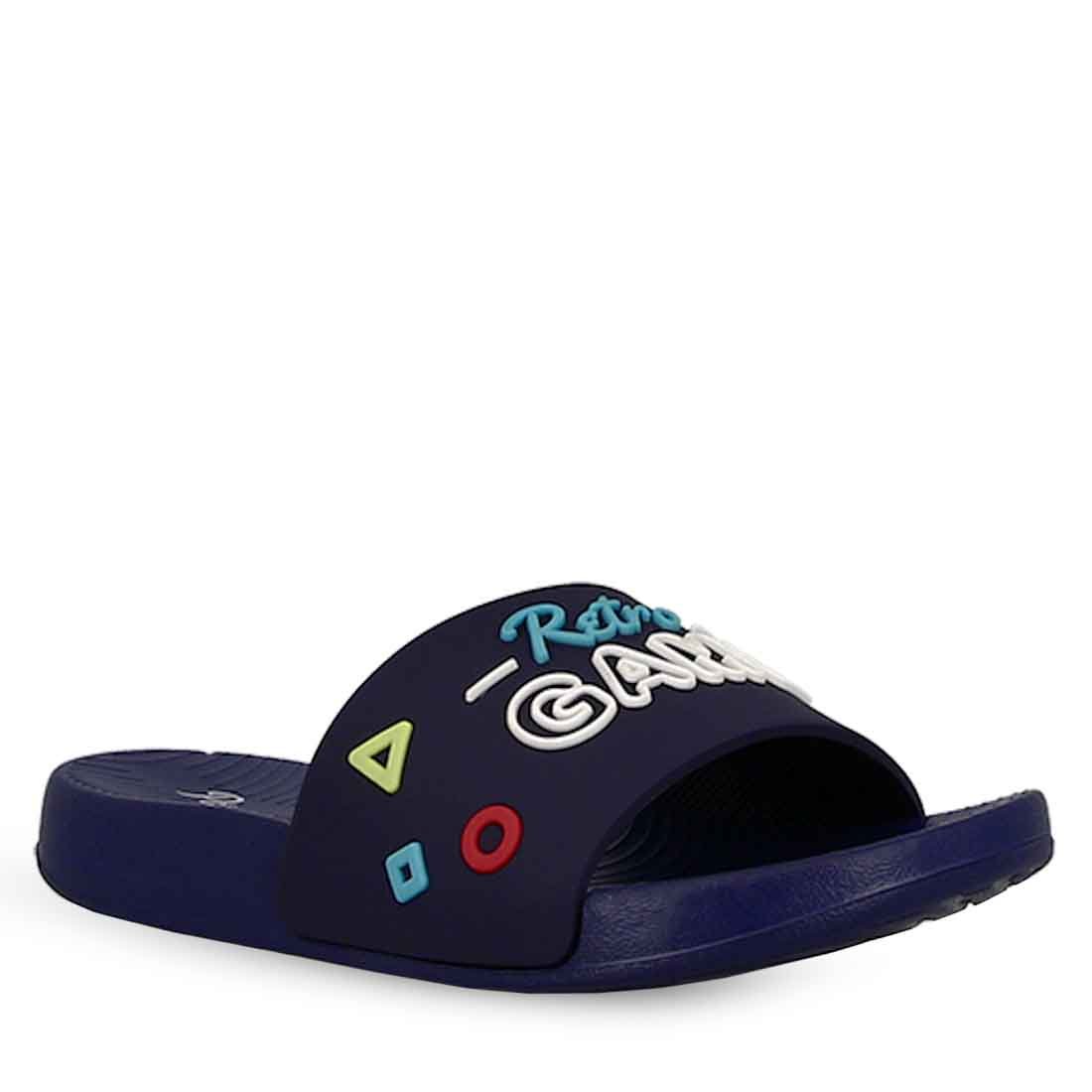 Αγορίστικες slip-on παντόφλες, σε μπλε χρώμα, με σχέδιο τηλεχειριστήριο & μότο RETRO GAME.
