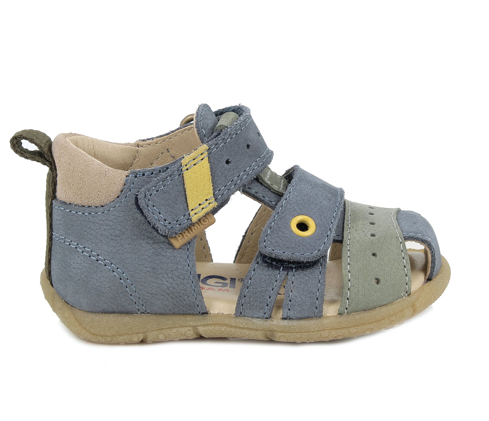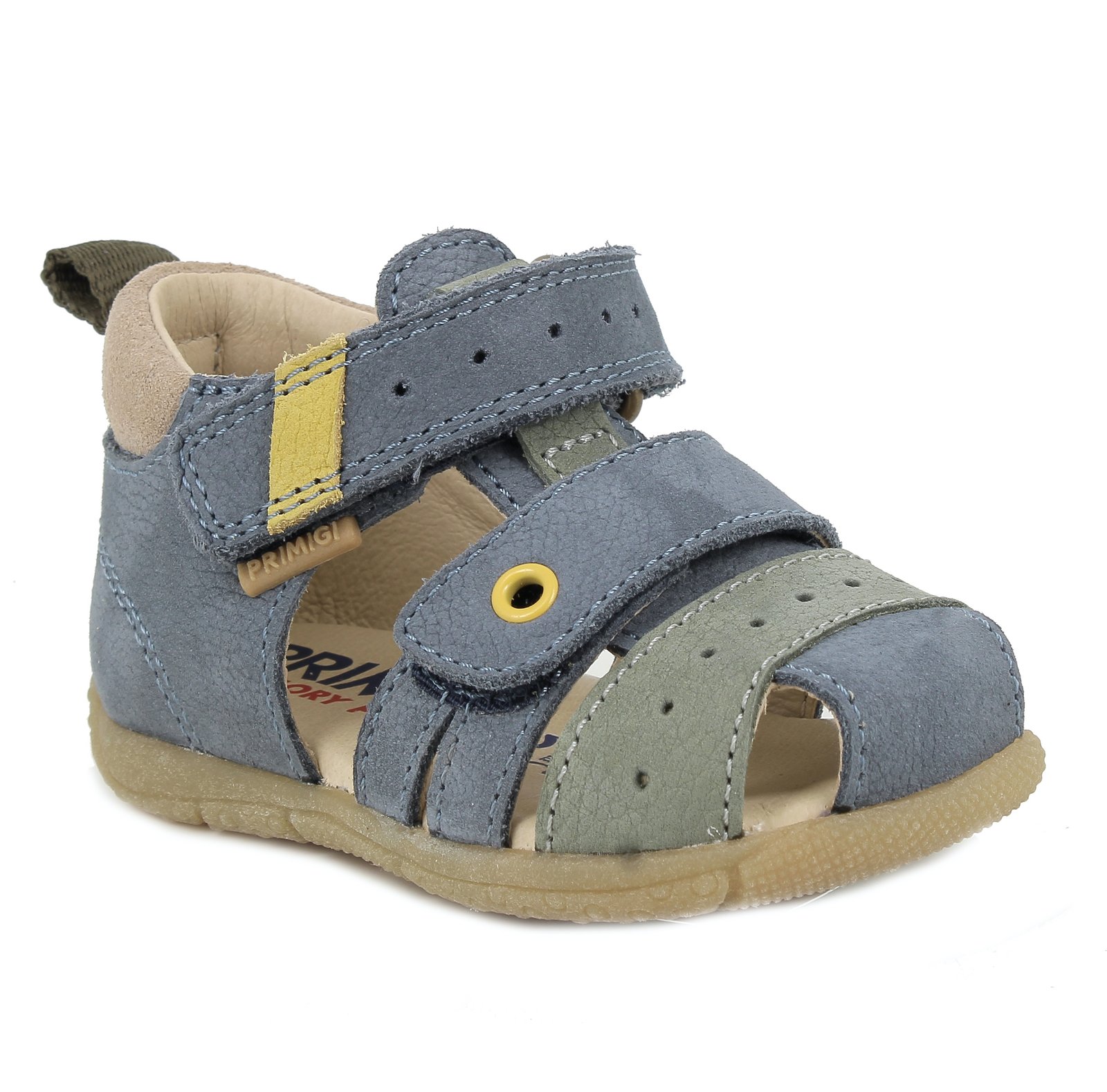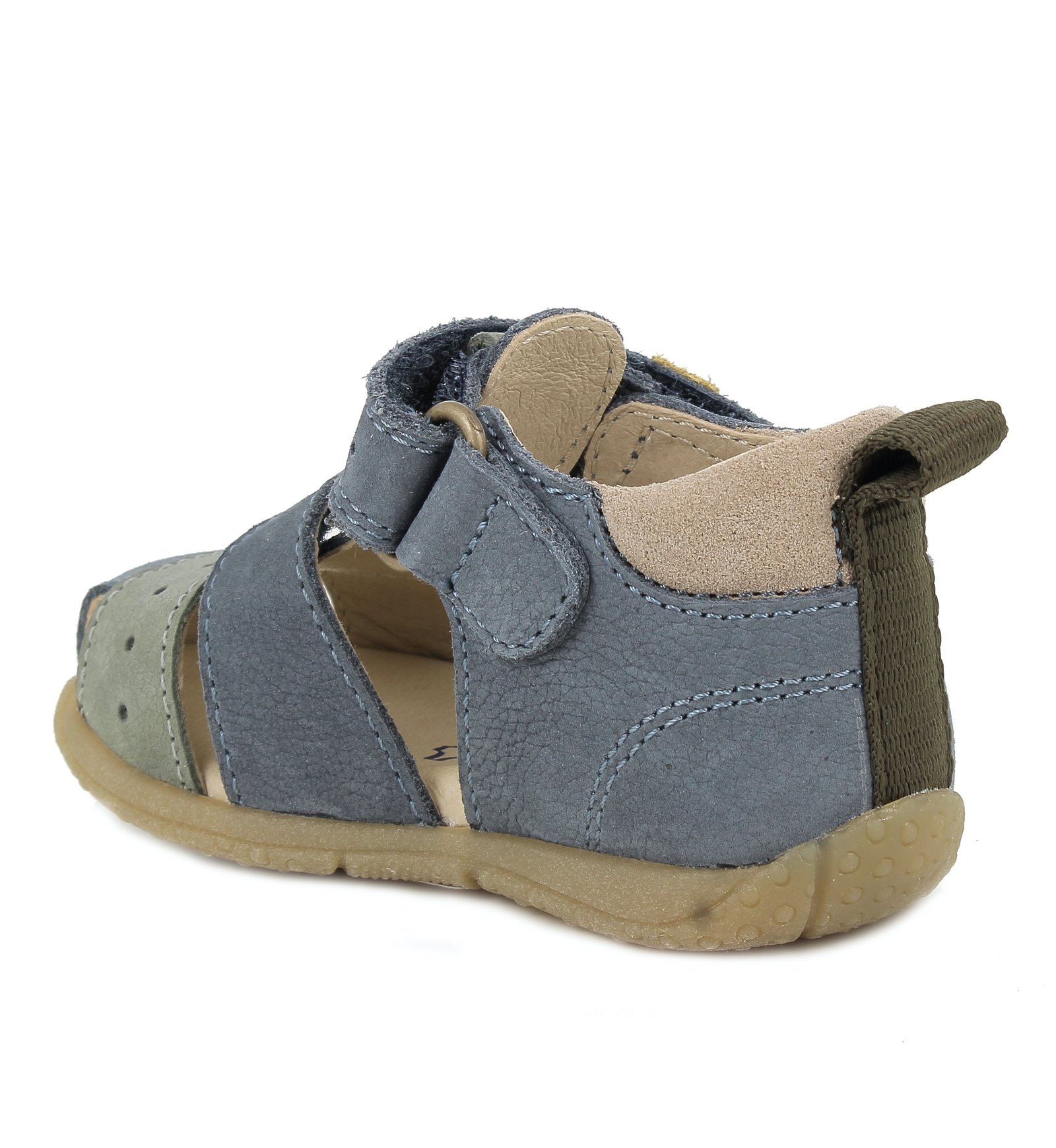 Αγορίστικο παπουτσοπέδιλο σε μπλε-ραφ χρώμα, με λαδί/μπεζ/καφέ λεπτομέρειες.