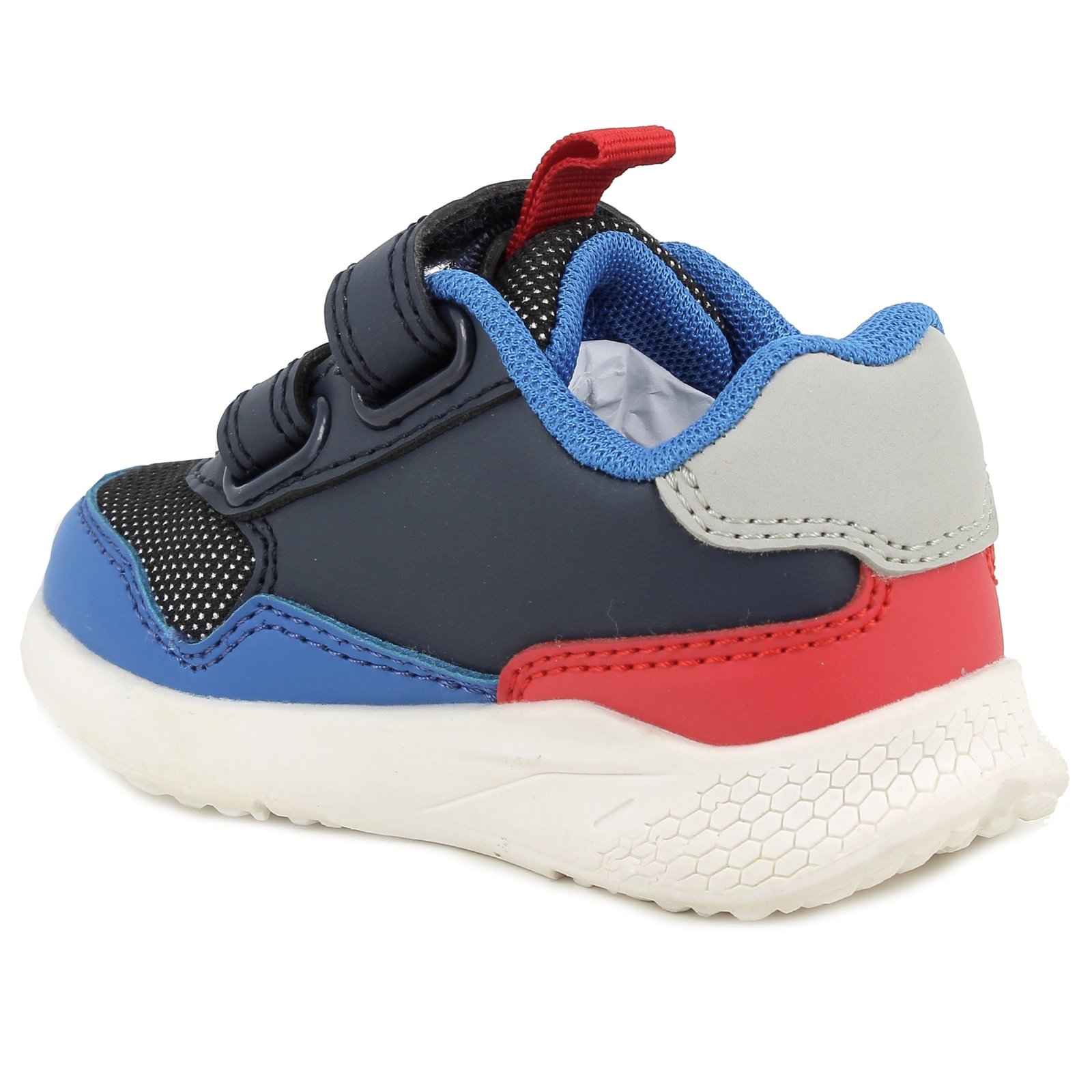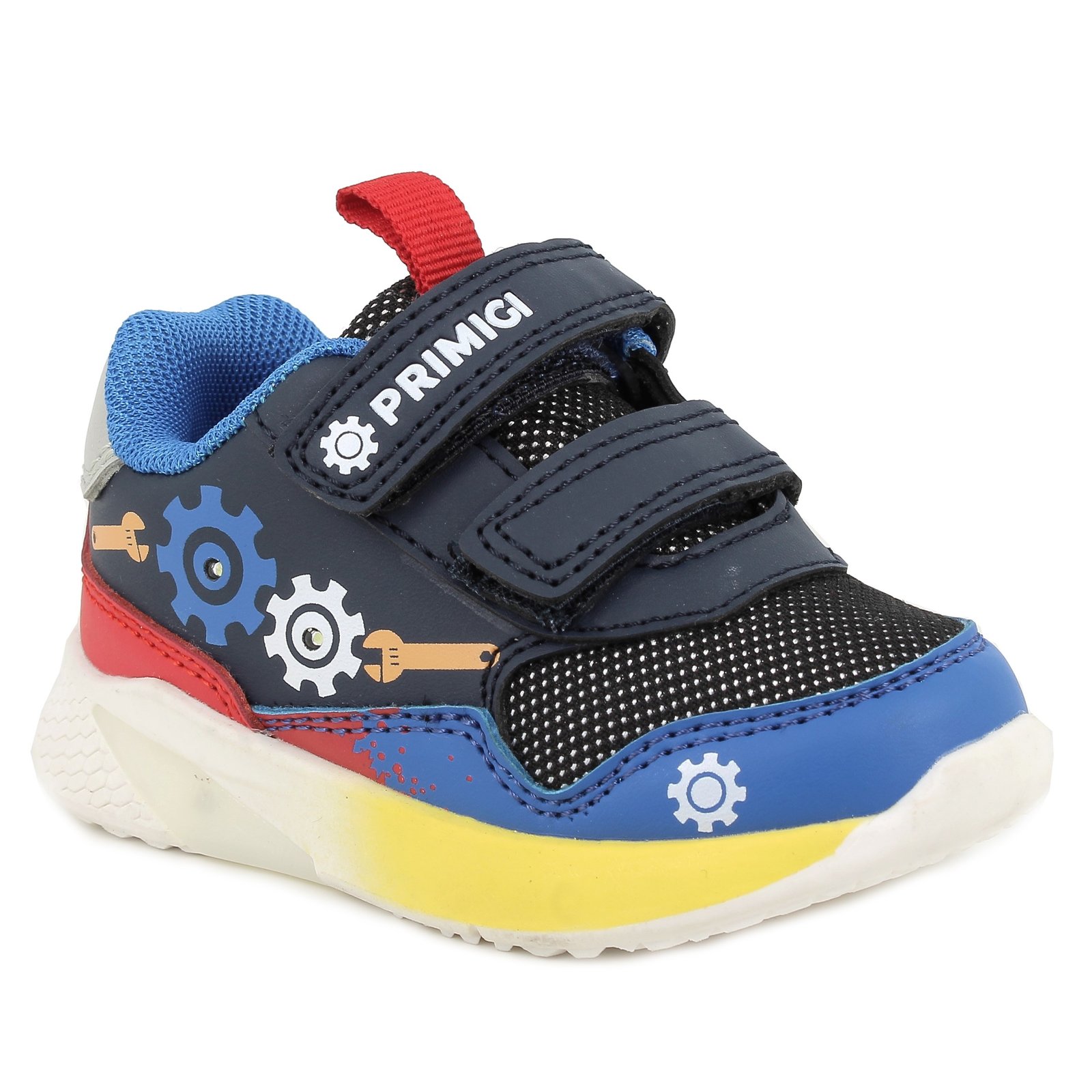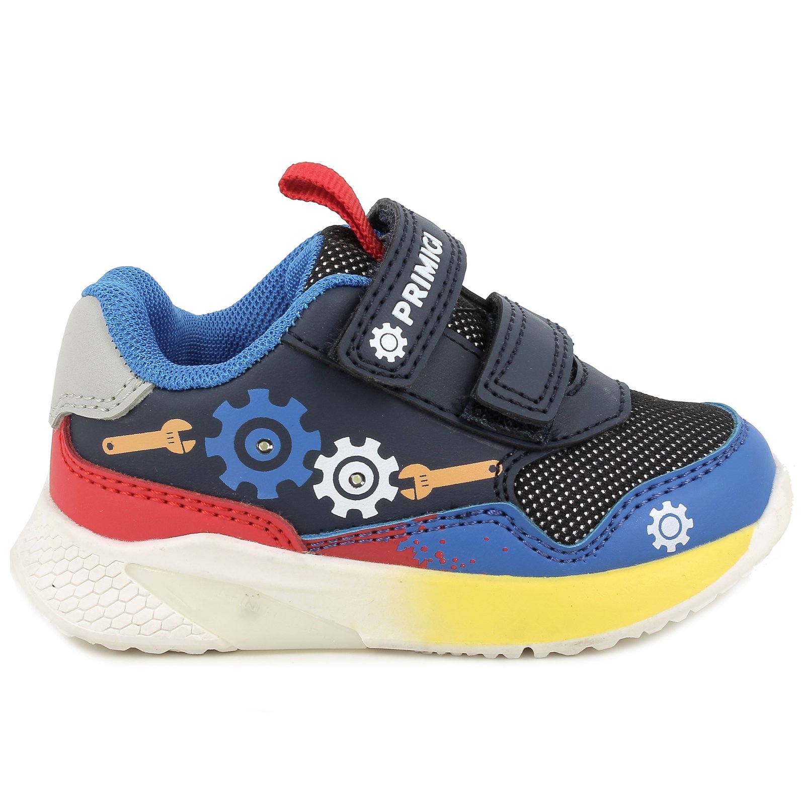 Αγορίστικα ανατομικά αθλητικά για τα πρώτα βήματα, στυλ sneakers, σε μπλε χρώμα με κόκκινες & κίτρινες λεπτομέρειες, σχέδιο γρανάζια & ΦΩΤΑΚΙΑ!
