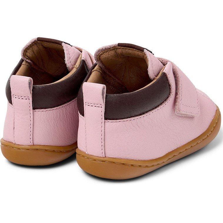 Ροζ και μπορντό παιδικά μποτάκια από δέρμα μοσχαριού με αφαιρούμενο πάτο EVA, σύστημα κλεισίματος με σκριτς σκρατς και εξωτερικές σόλες από ανακυκλωμένο λάστιχο (20% ανακυκλωμένο).