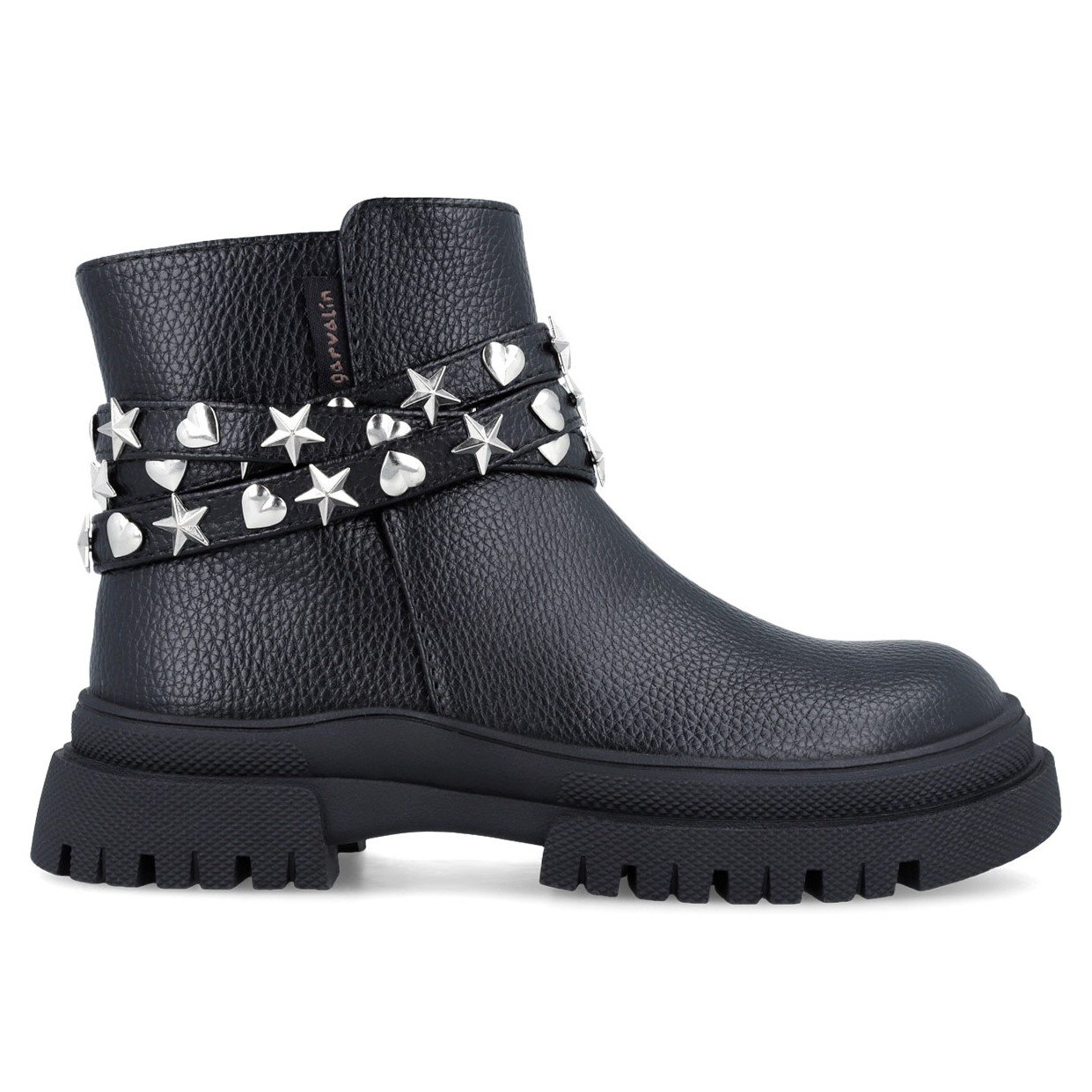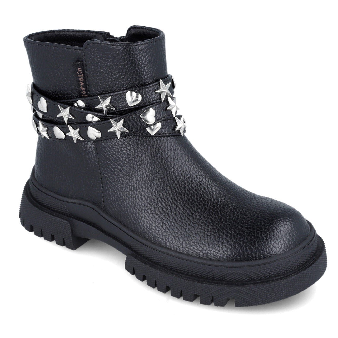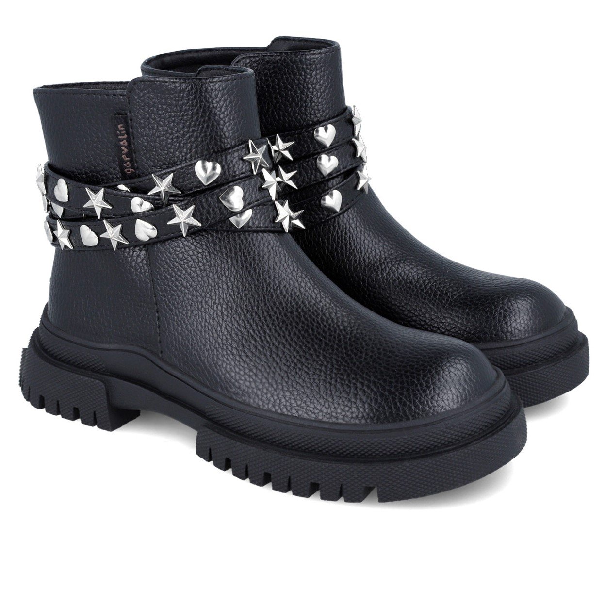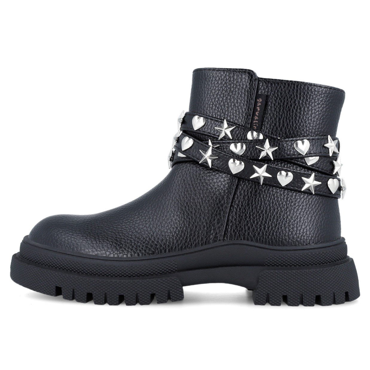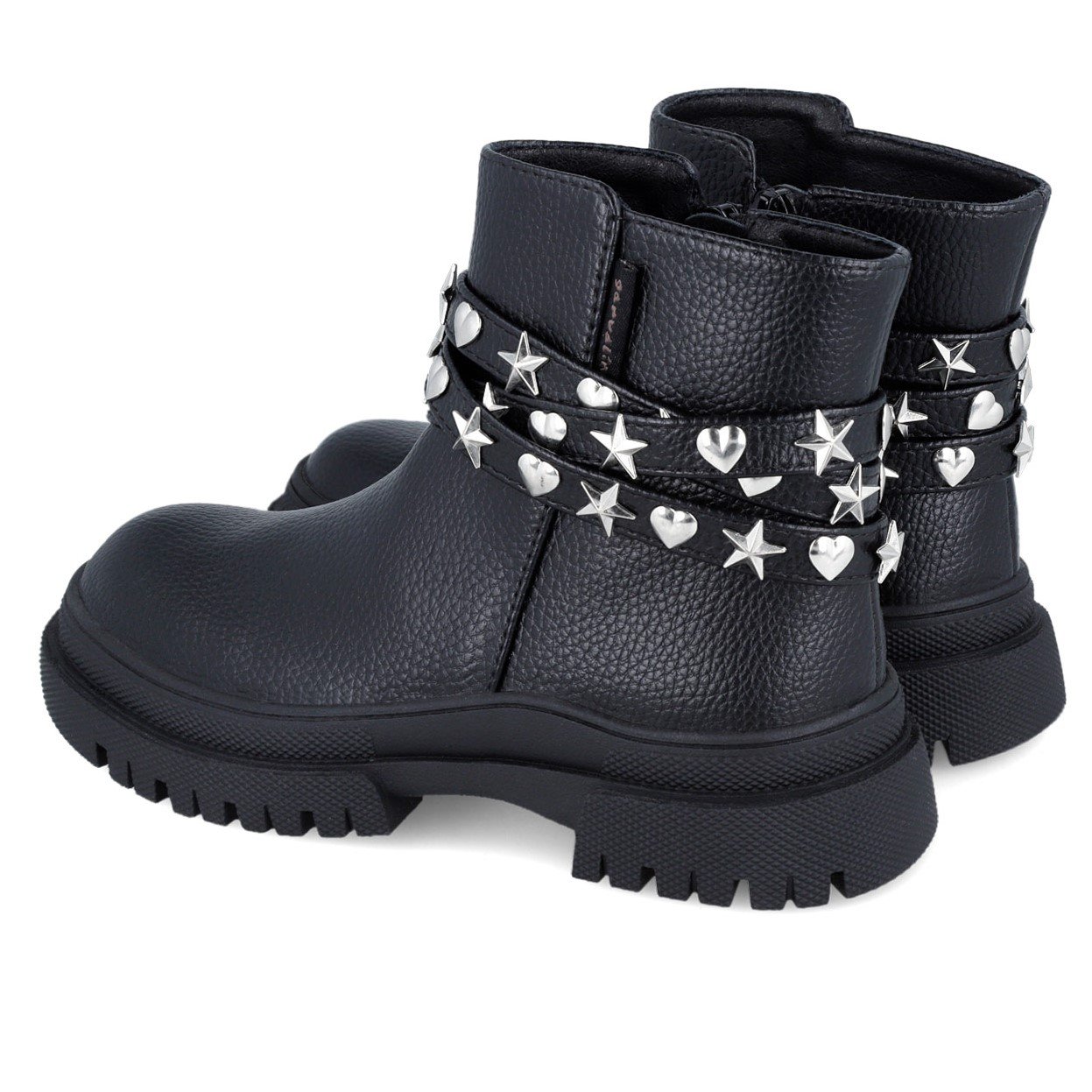 Παιδικά μποτάκια, στυλ biker, σε ματ μαύρο χρώμα, με λεπτομέρεια λουράκι με αστέρια & καρδούλες στον αστράγαλο.