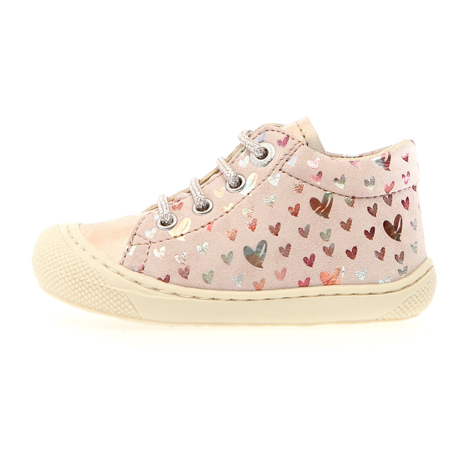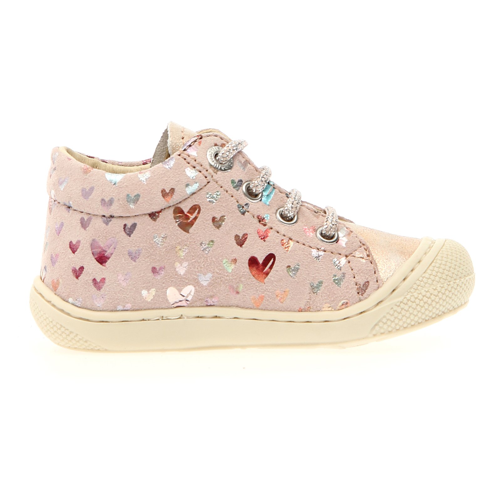 Παιδικά δερμάτινα ανατομικά μποτάκια σε ροζ χρώμα, με μεταλλιζέ ιριδίζουσες καρδούλες & glitter κορδόνια.