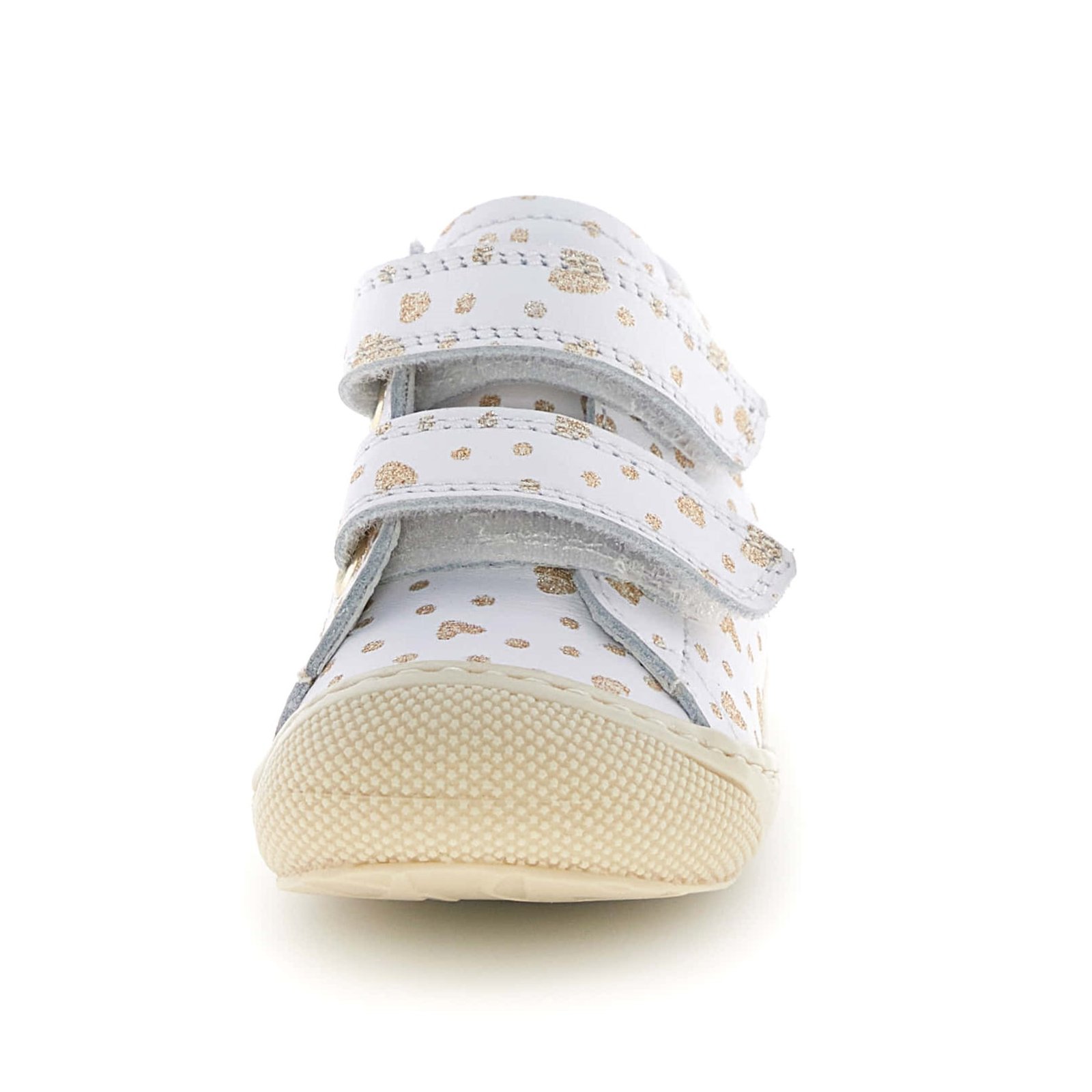 Παιδικά δερμάτινα ανατομικά μποτάκια σε λευκό χρώμα, με διακριτικό χρυσό πουά σχέδιο & καρδούλες.