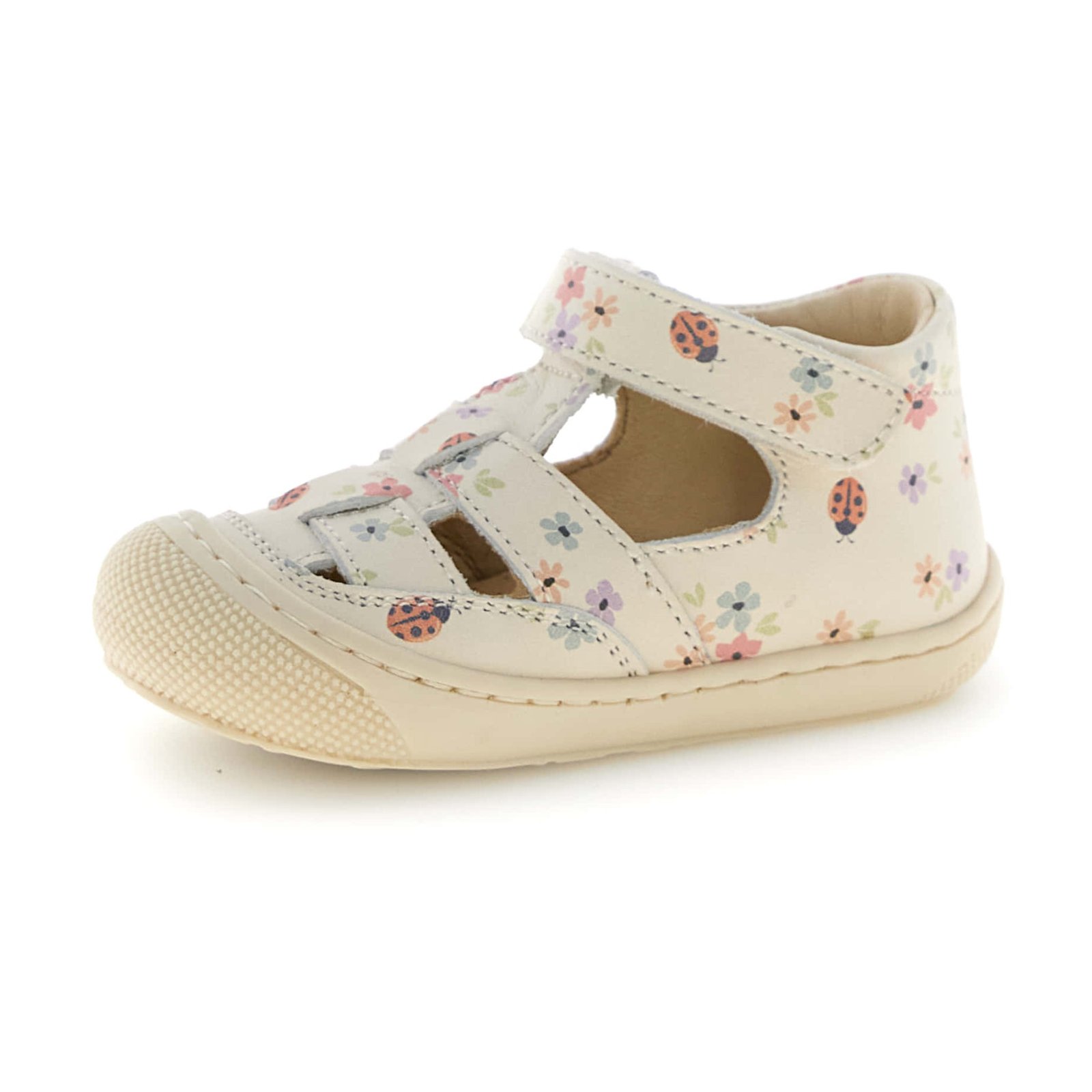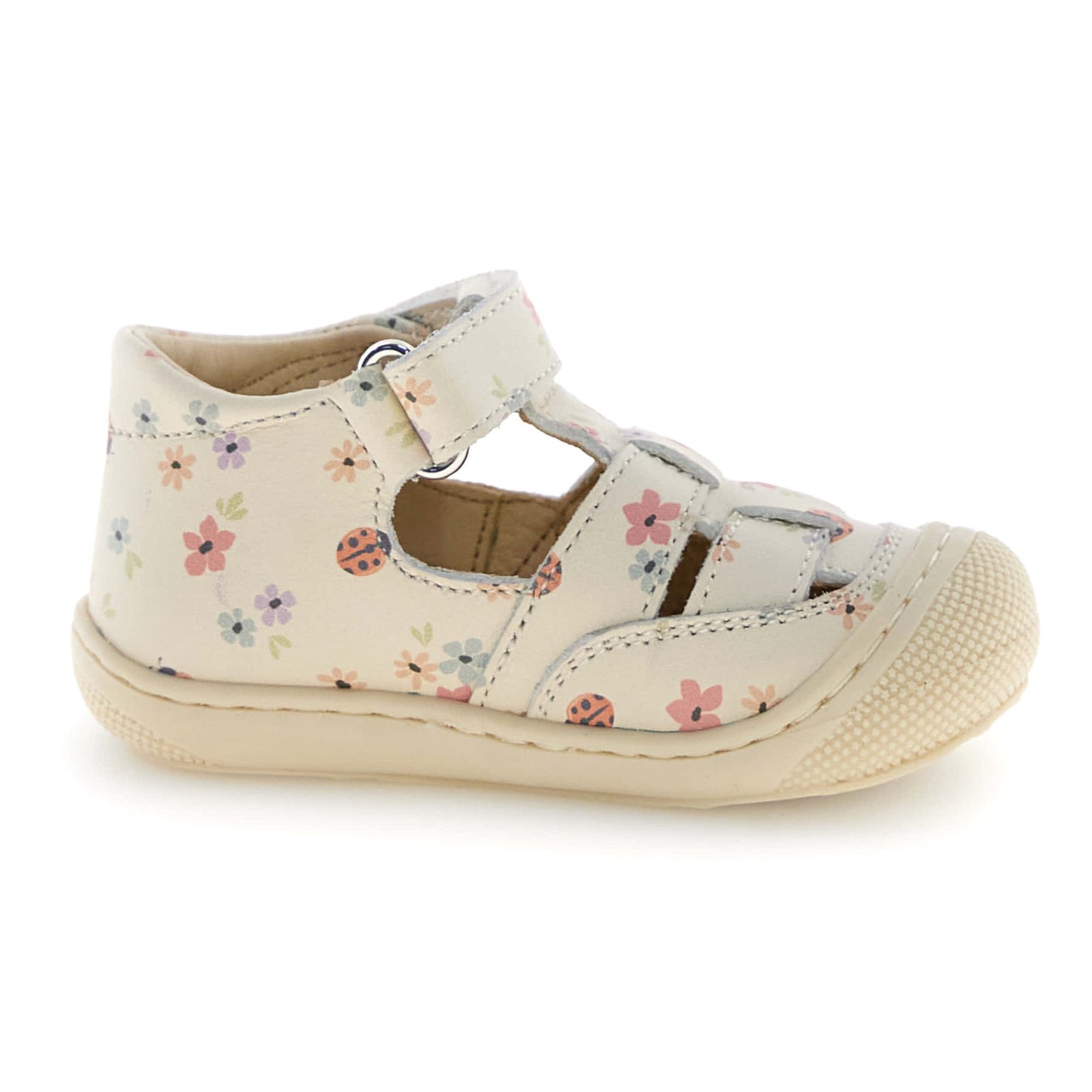 Παιδικά δερμάτινα παπουτσοπέδιλα σε εκρού χρώμα, με σχέδιο πασχαλίτσες-λουλουδάκια.