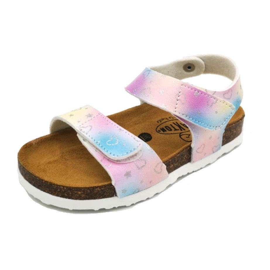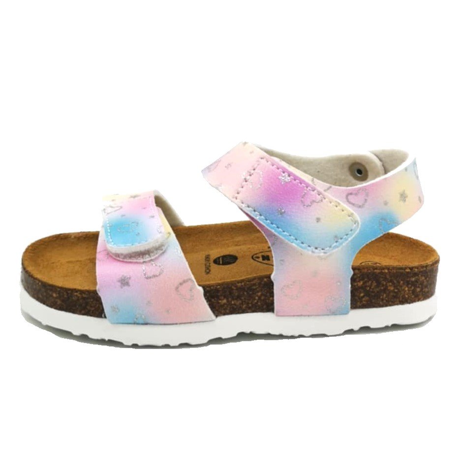 Παιδικά πέδιλα με ανατομικό πέλμα ,τύπου σκαφάκι ,σε πολύχρωμη βάση, με σταμπωτό ασημί σχέδιο καρδούλες/αστεράκια.