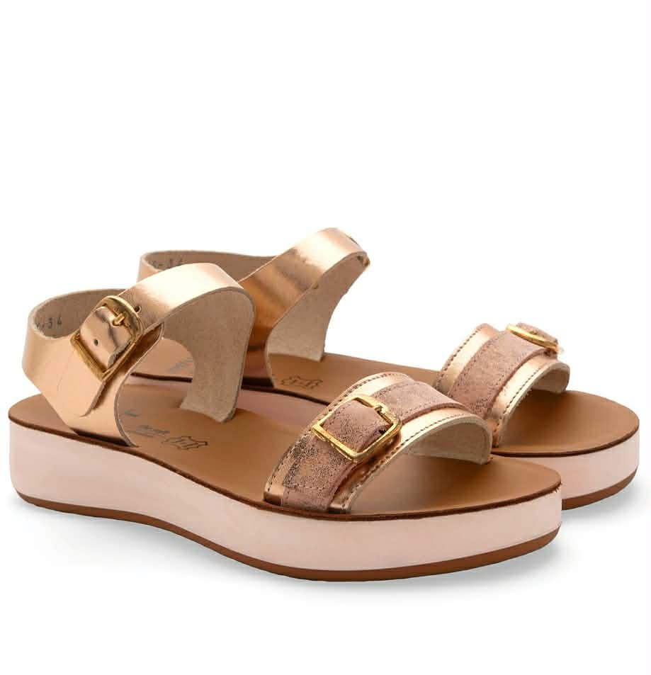Παιδικά δερμάτινα πέδιλα σε ροζ/χρυσό χρώμα, με χρυσές λεπτομέρειες.
