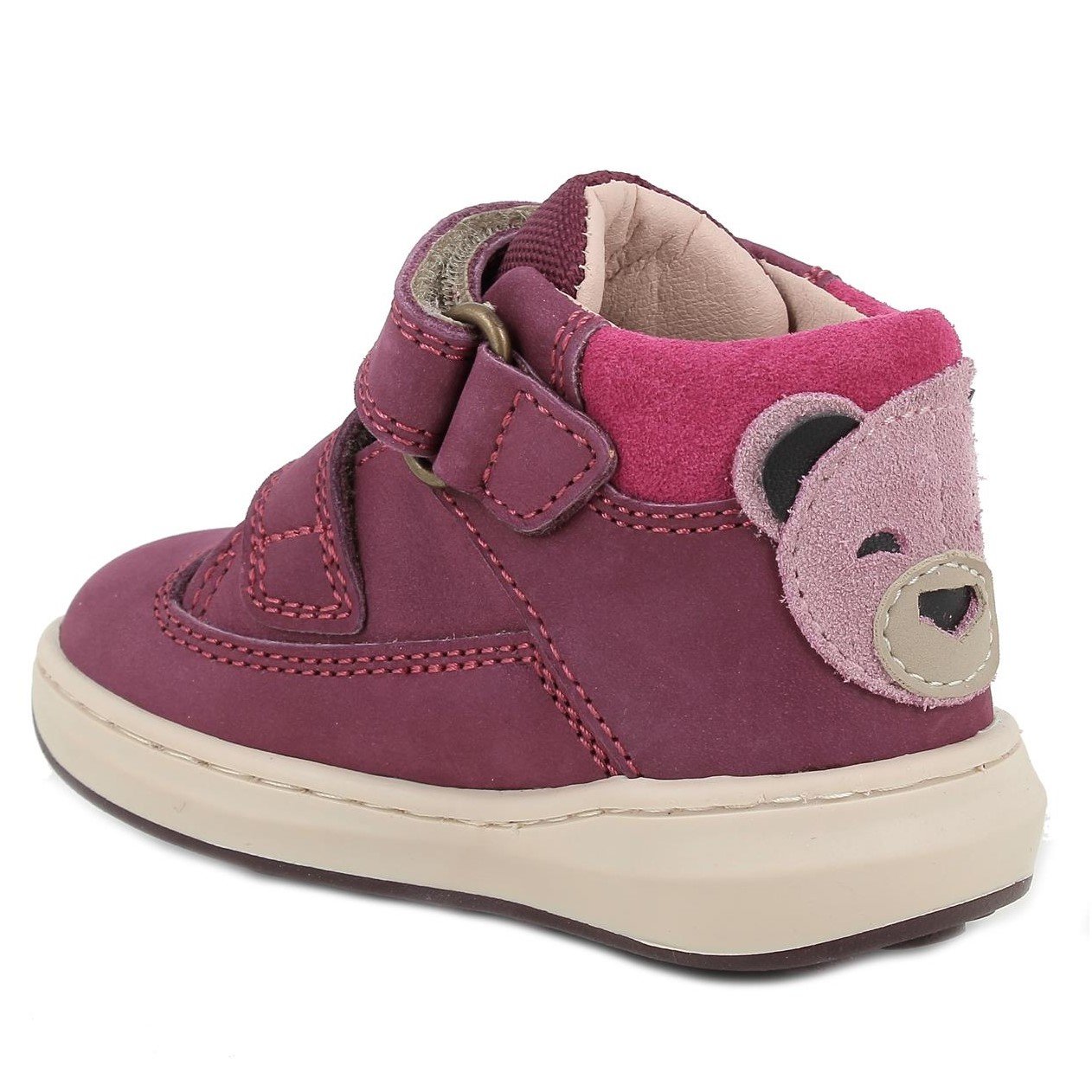 Κοριτσίστικα δερμάτινα μποτάκια για τα πρώτα βήματα, σε μωβ-φούξια χρώμα, με σχέδιο αρκουδάκι στη φτέρνα.
