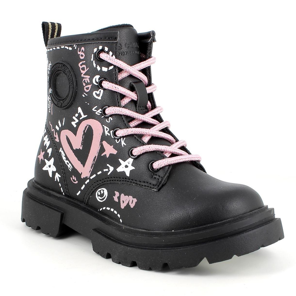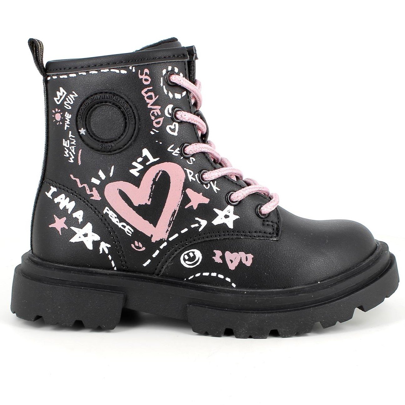 Κοριτσίστικα μποτάκια, στυλ αρβυλάκι, σε μαύρο χρώμα με σταμπωτά ροζ σχέδια.