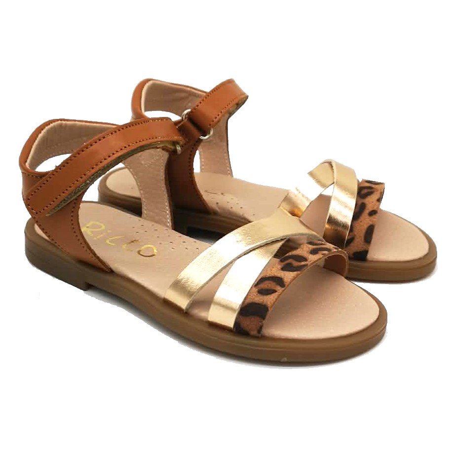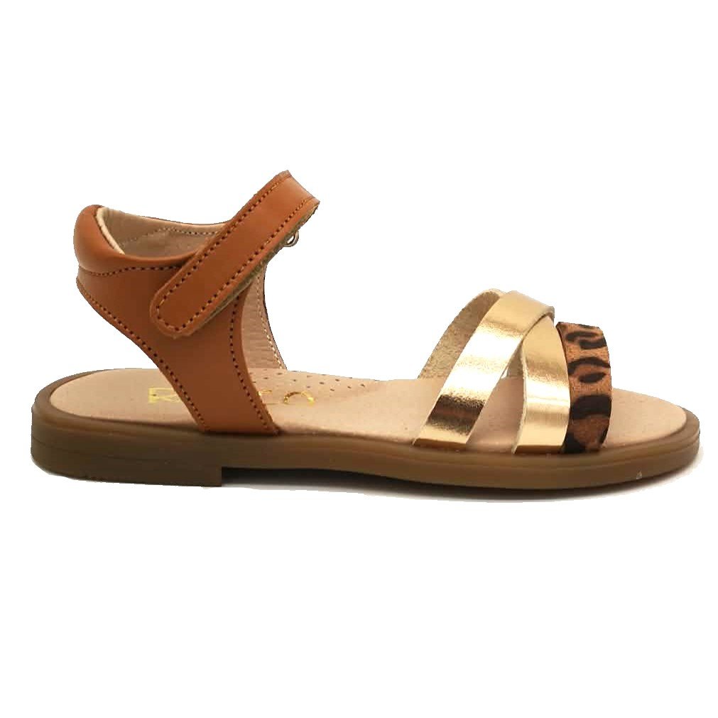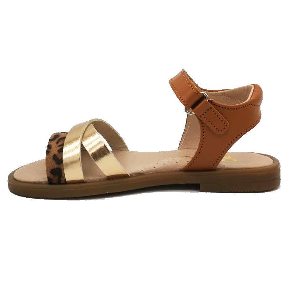 Παιδικά δερμάτινα πέδιλα, σε χρώμα καφέ/ταμπά, με σχέδιο μπρονζέ & λεοπάρ λουράκια.