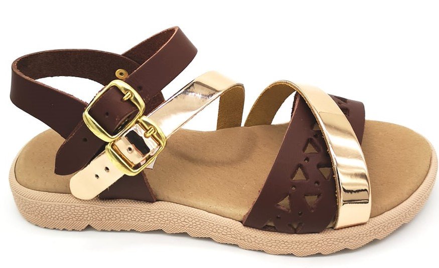 Παιδικά δερμάτινα πέδιλα σε σκούρο καφέ χρώμα με λουράκια σε μπρονζέ αποχρώσεις.