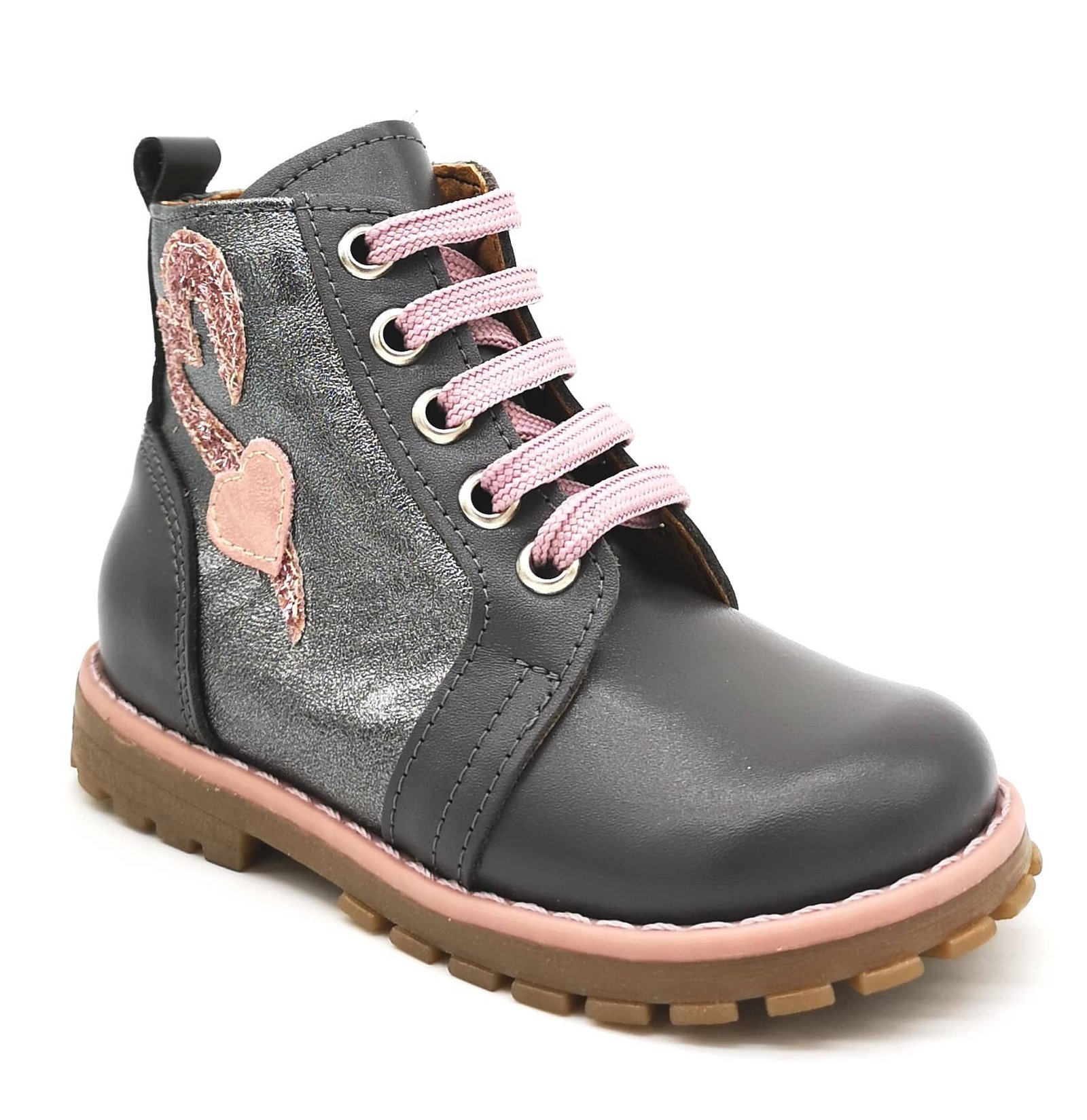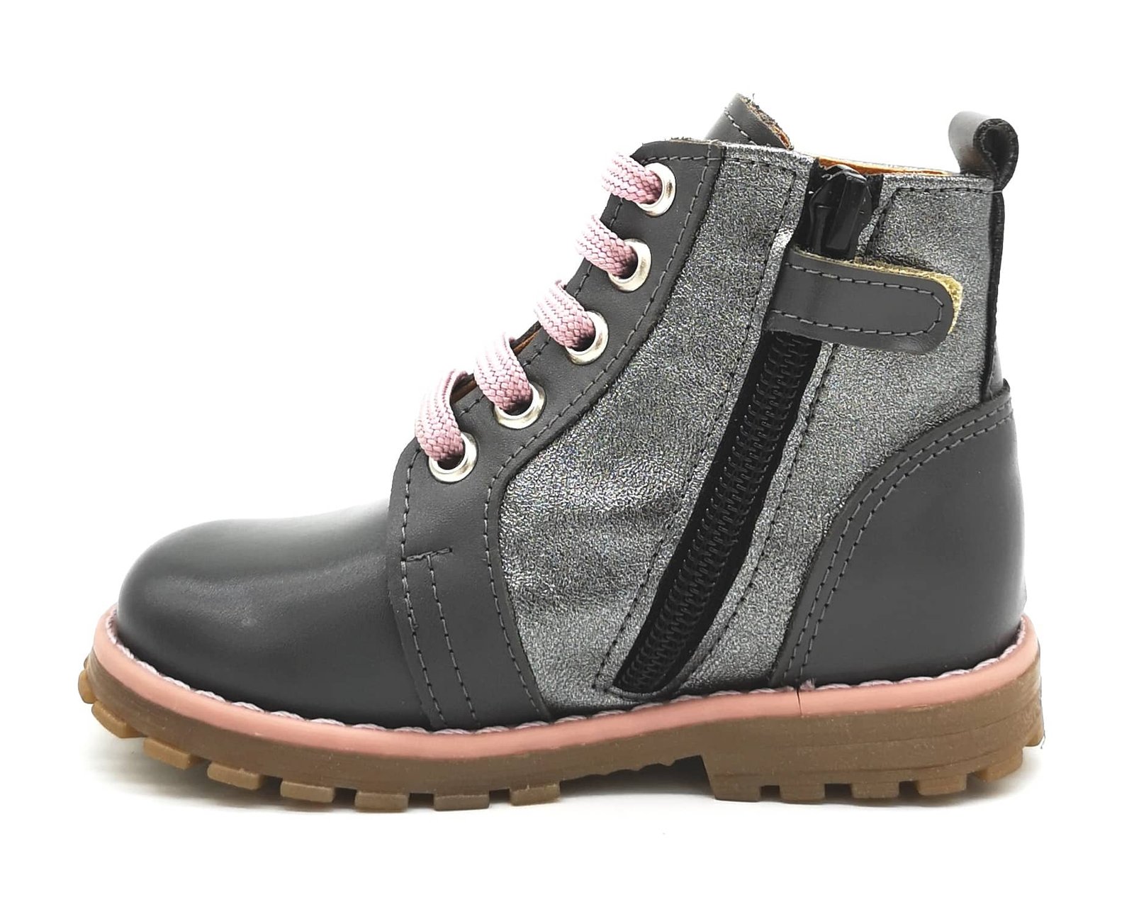 Παιδικά δερμάτινα μποτάκια, στυλ αρβυλάκια, σε χρώμα γκρι/ανθρακί με μεταλλιζέ σχέδιο στο πλάι & ροζ λεπτομέρειες.