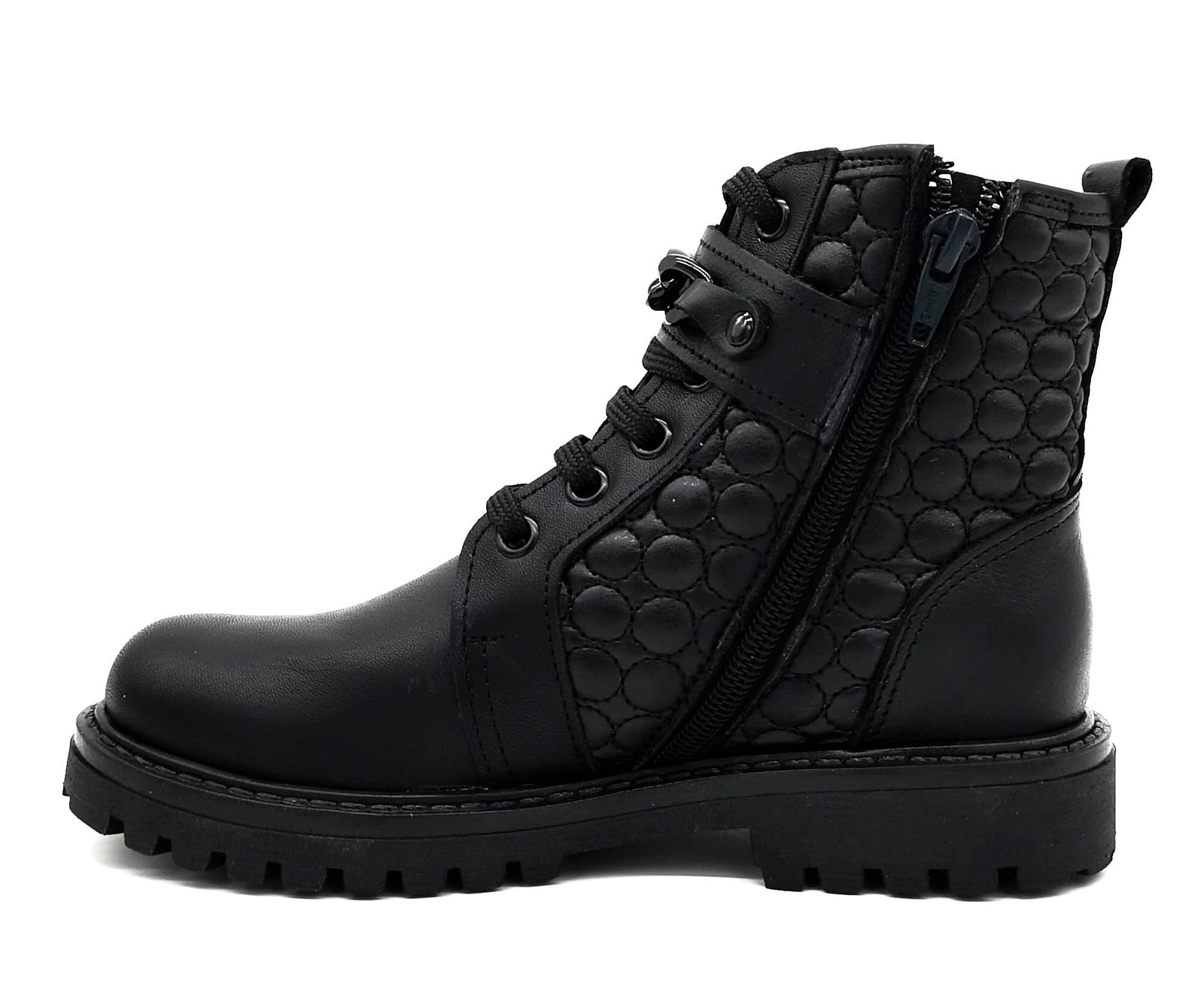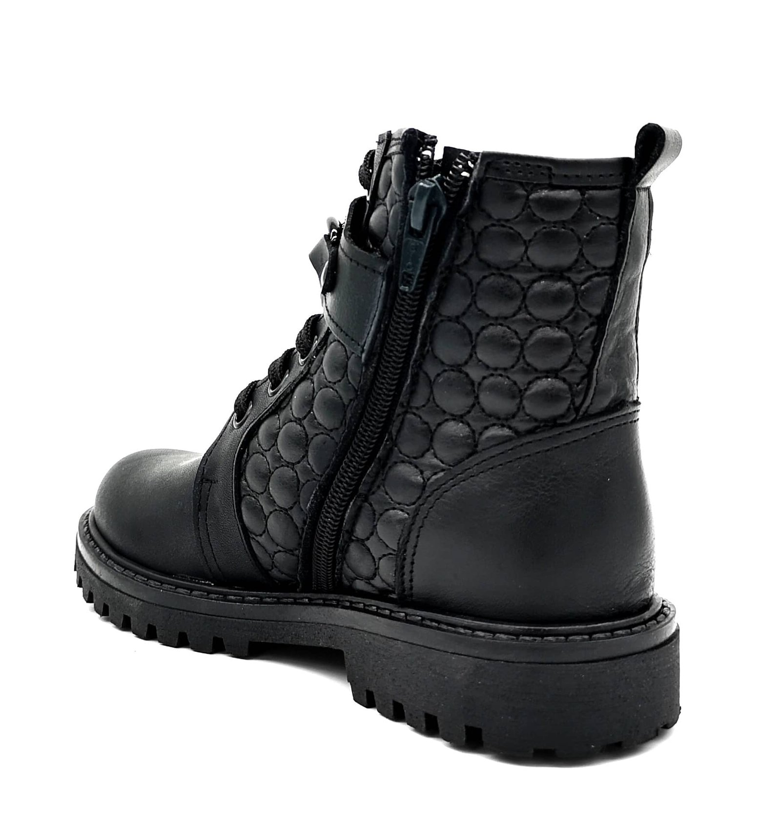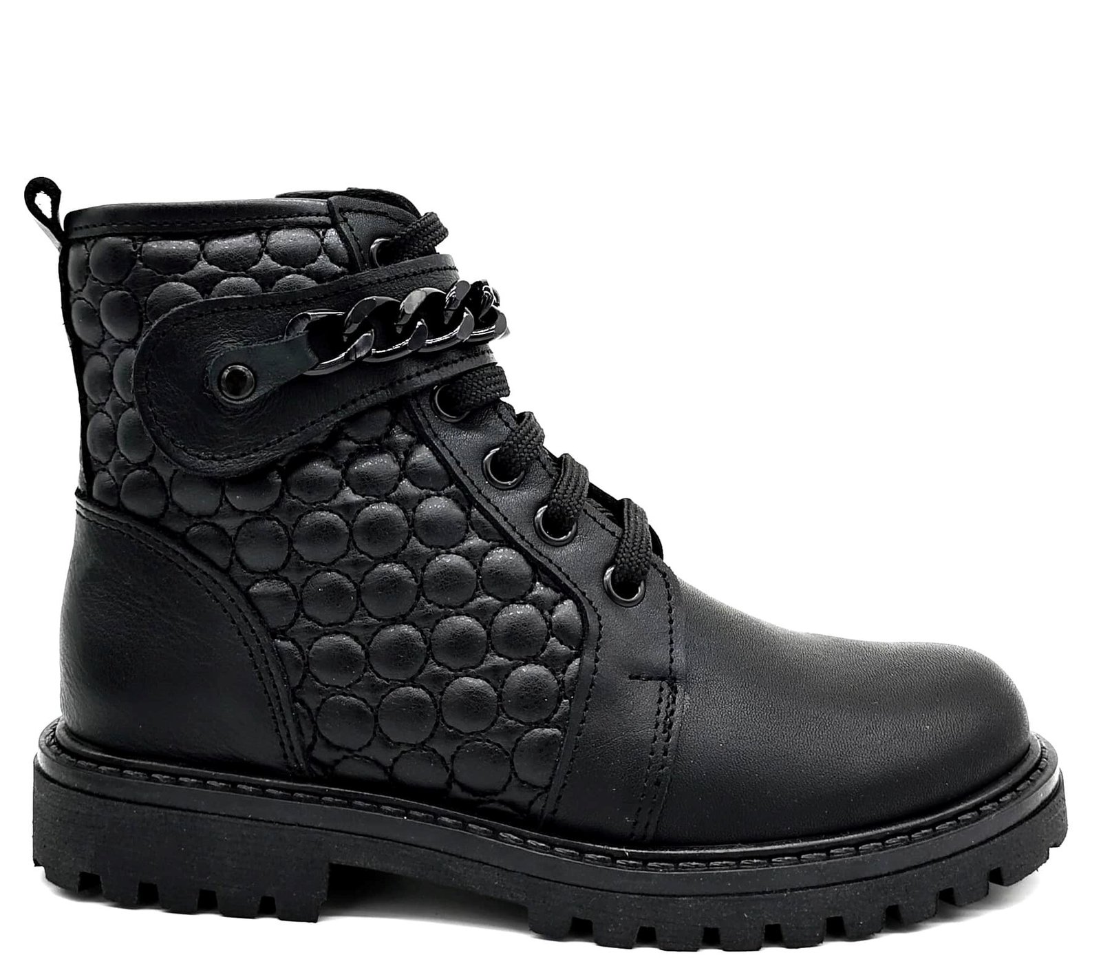 Παιδικά δερμάτινα μποτάκια, στυλ αρβυλάκια, σε ματ μαύρο χρώμα, με ιδιαίτερο σχέδιο & λεπτομέρεια λουράκι με αλυσίδα.