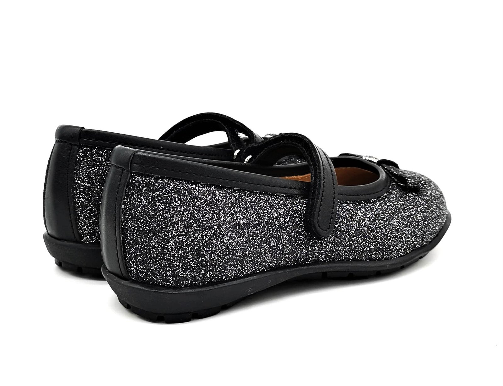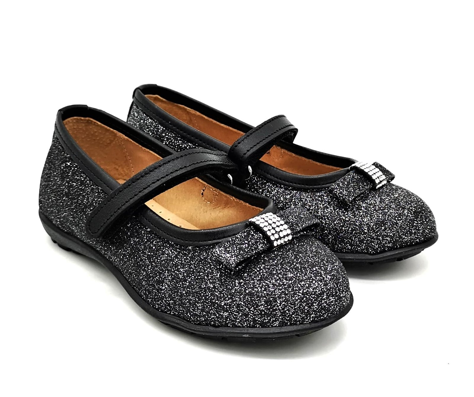 Παιδικές δερμάτινες μπαρέτες σε μαύρο glitter χρώμα με φιογκάκι με στρας.