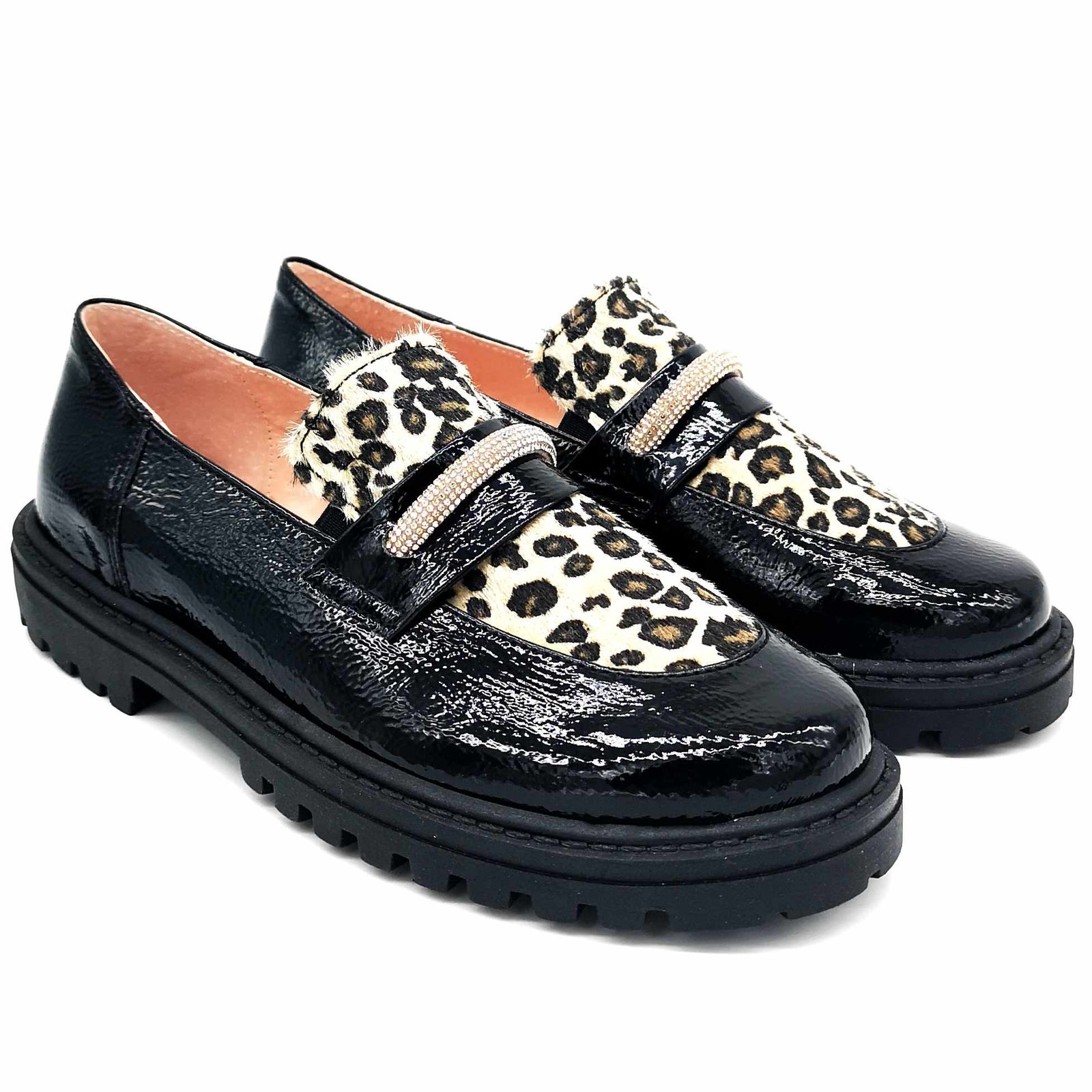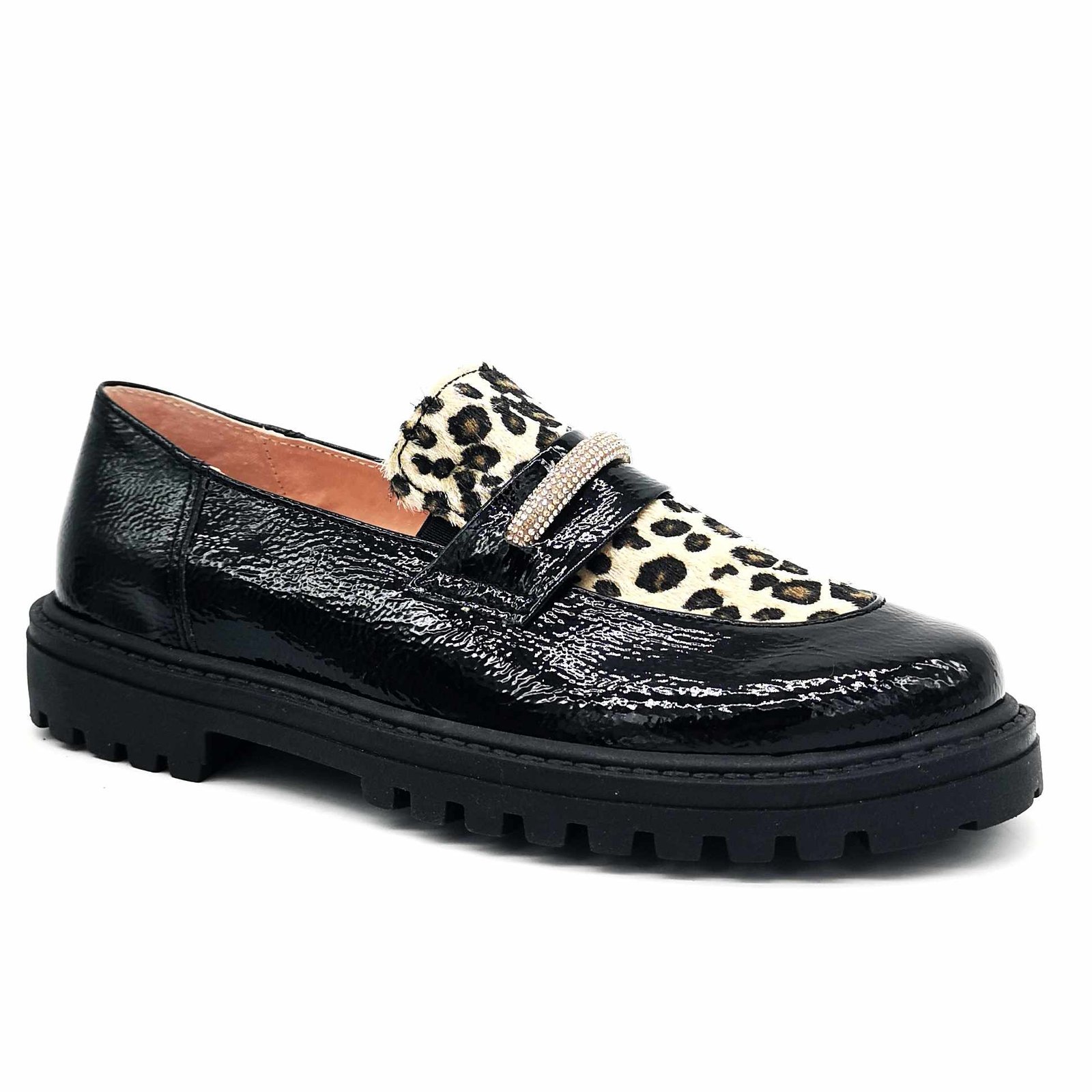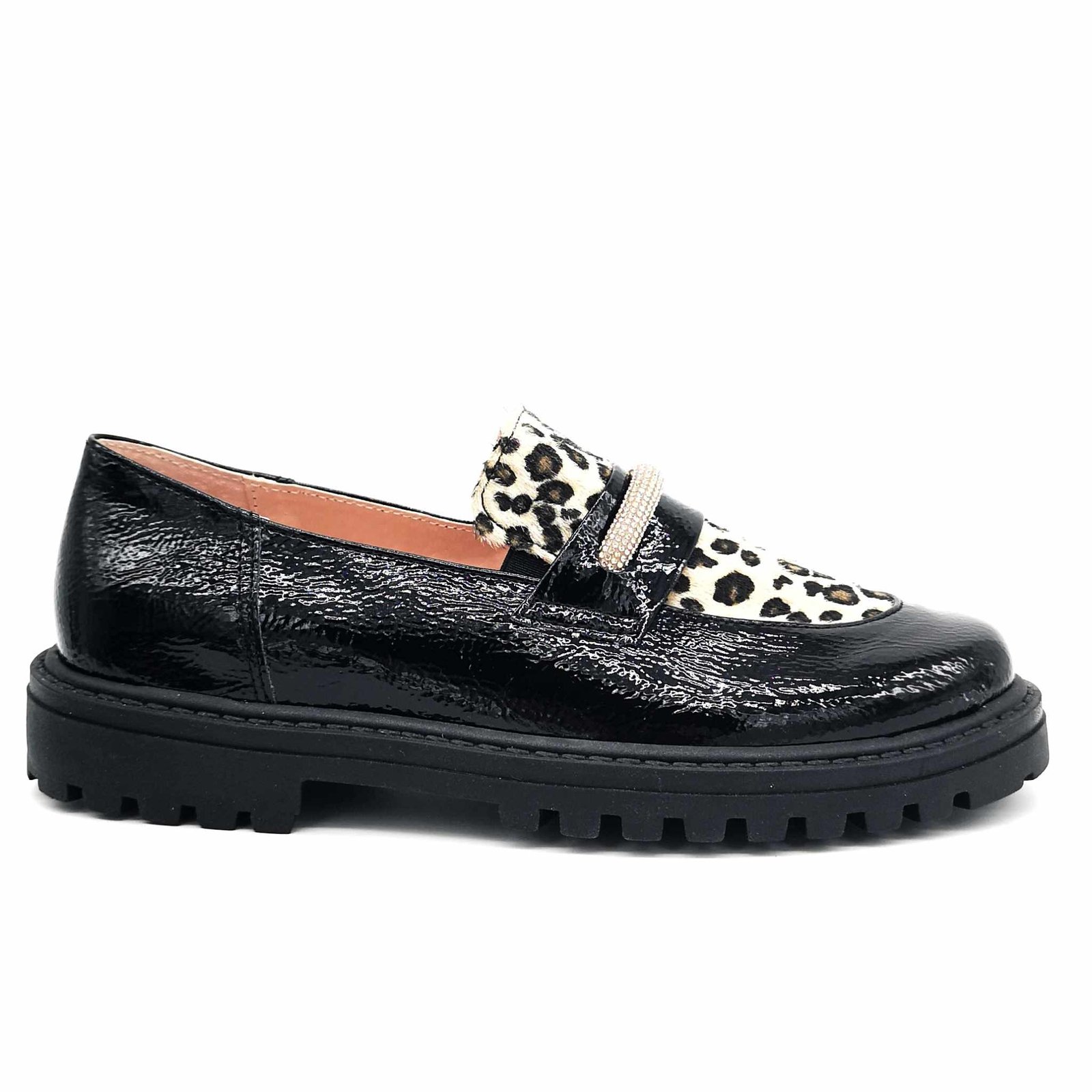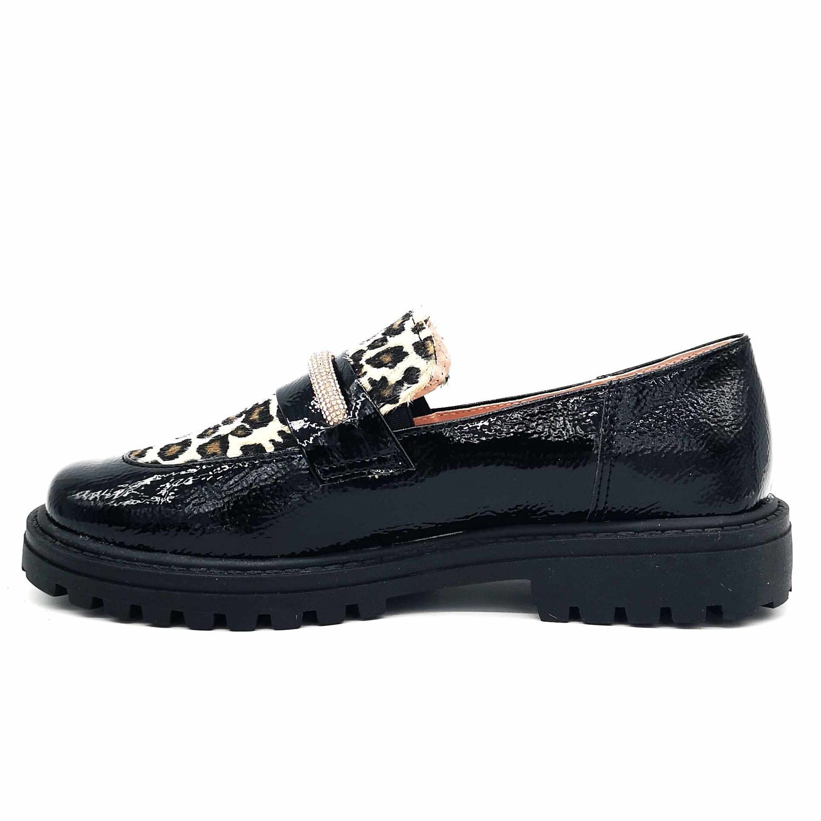 Παιδικά δερμάτινα μοκασίνια, σε γυαλιστερό μαύρο χρώμα, με λεοπάρ σχέδιο στη γλώσσα & διακριτική λεπτομέρεια με στρας.