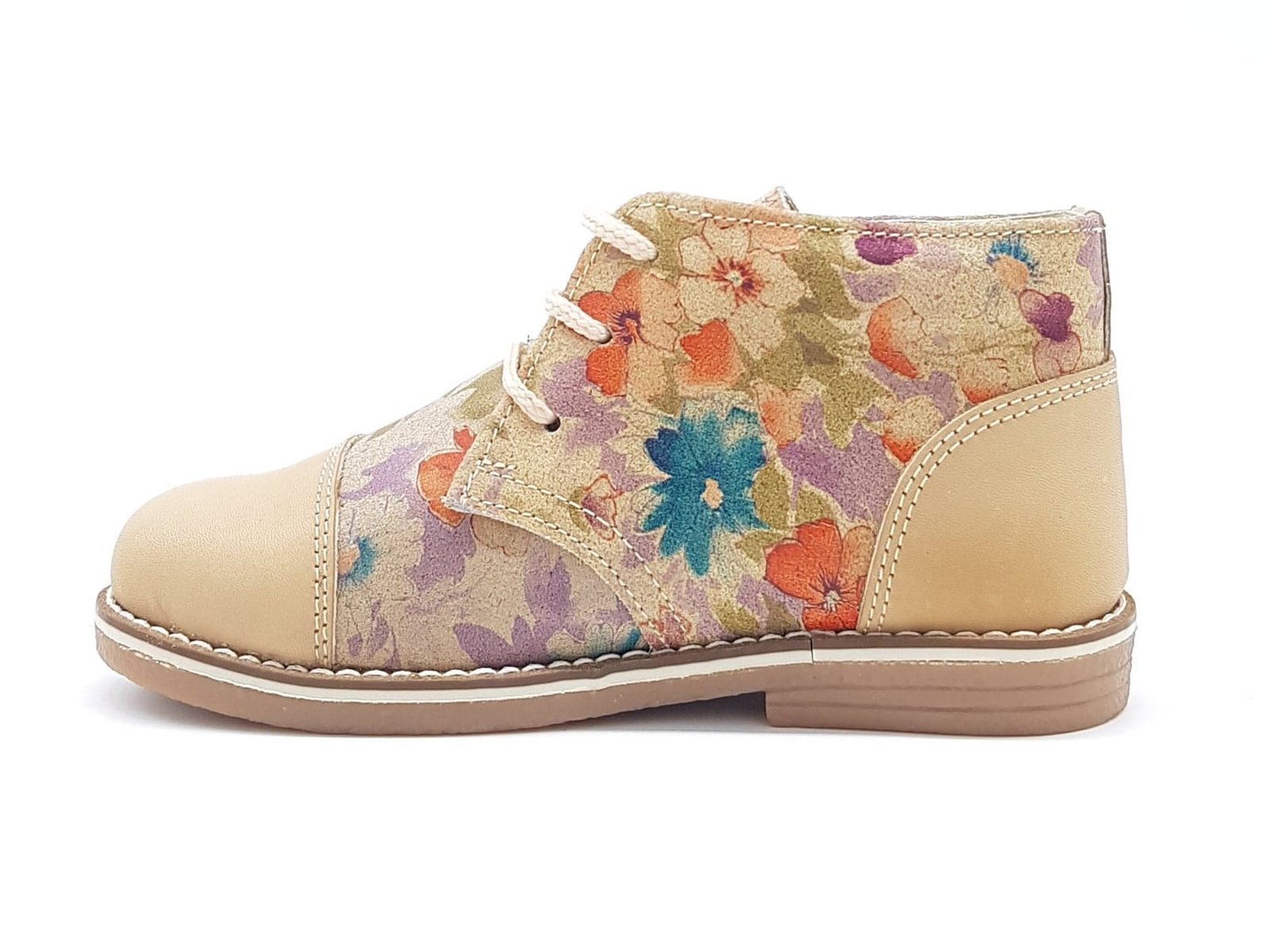 Παιδικά μποτάκια σε μπεζ χρώμα, με πολύχρωμο λουλουδάτο σχέδιο.