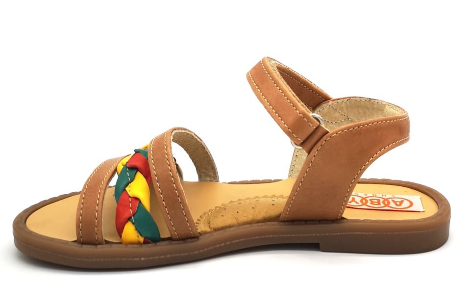 Παιδικά δερμάτινα πέδιλα σε ταμπά χρώμα, με πολύχρωμη πλεξούδα.