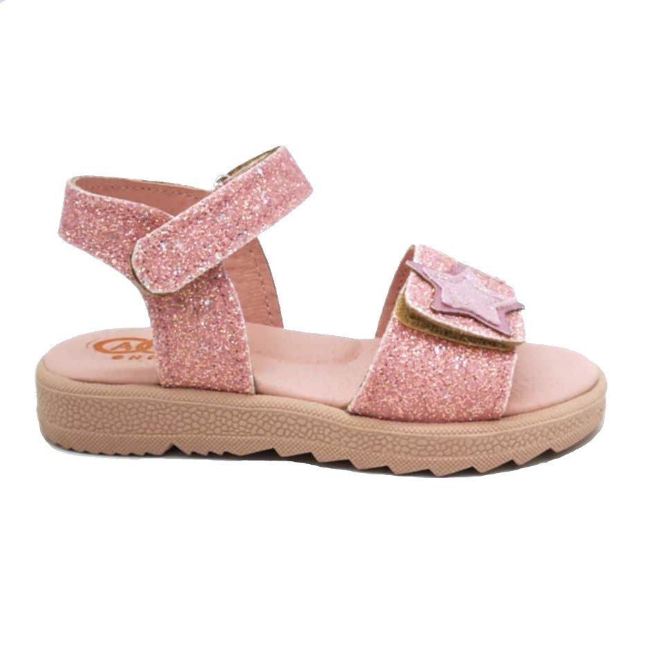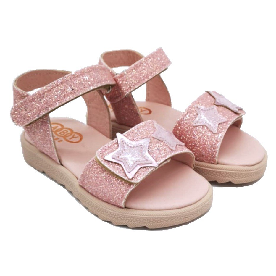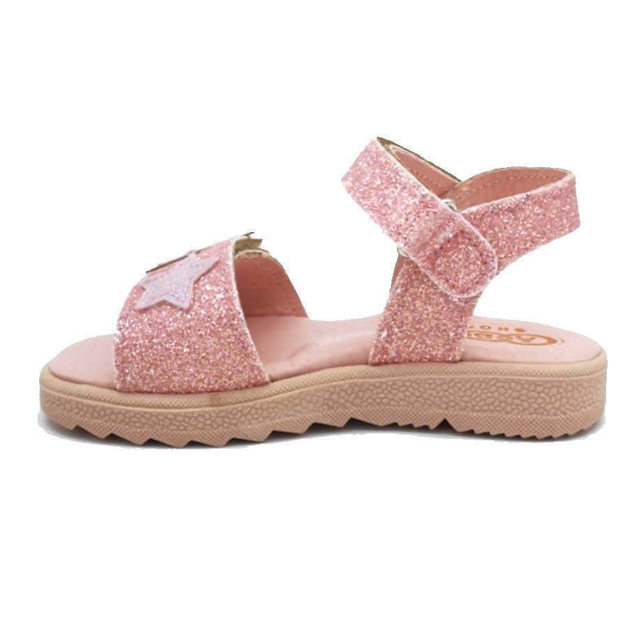 Παιδικά δερμάτινα πέδιλα σε ροζ glitter χρώμα με σχέδιο αστεράκια.