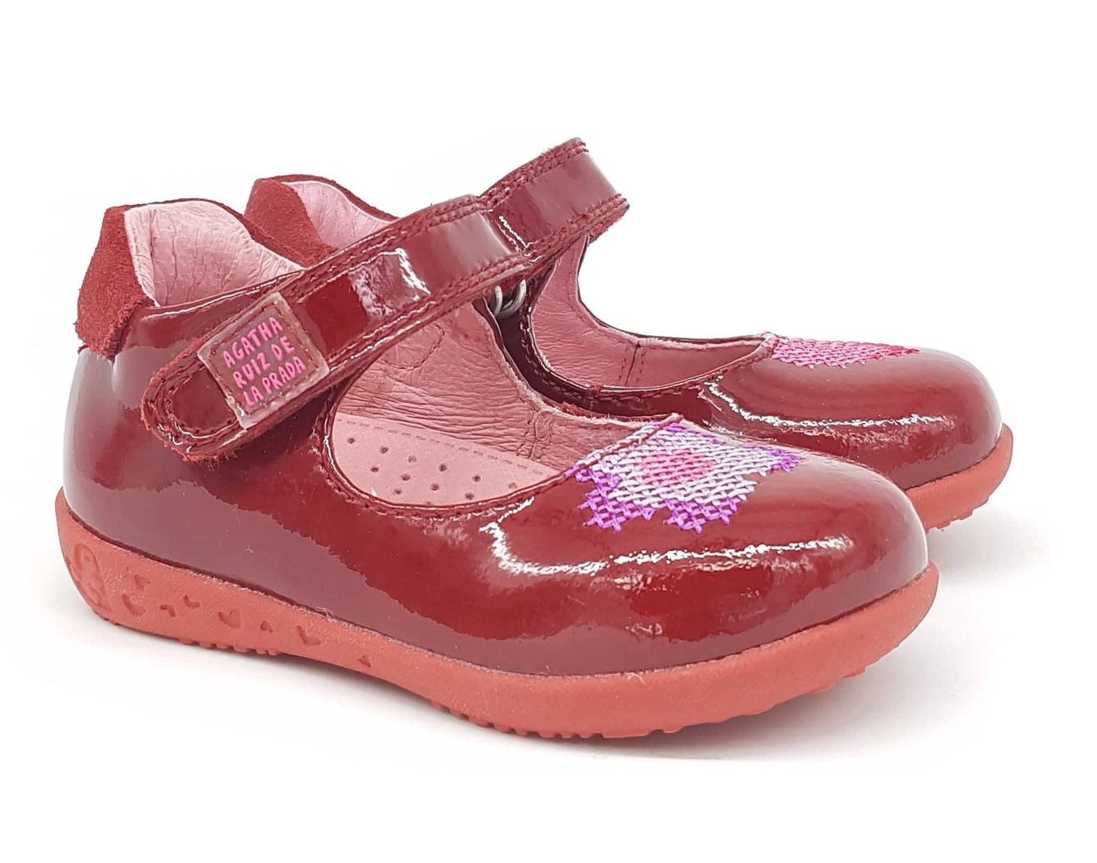 Παιδικές λουστρίνι μπαρέτες σε λουστρίνι κόκκινο χρώμα με κεντημένο σχέδιο λουλούδι στο δεξί και καρδούλα στο αριστερό πόδι.