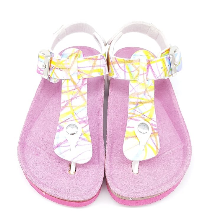 Παιδικά πέδιλα με ανατομικό πέλμα,τύπου σκαφάκι,σε πολύχρωμο σχέδιο.Διαθέτουν ανατομική βάση σόλας, κατασκευασμένη από δέρμα, παρέχοντας τέλεια εφαρμογή, καθώς είναι κατάλληλα σχηματισμένη για το πέλμα.Η κυρίως σόλα είναι εξαιρετικά ελαφριά, φτιαγμένη από υλικό EVA (φελλός και λάτεξ), διαμορφωμένη ώστε να απορροφά τους κραδασμούς.Το κάτω μέρος της σόλας διαθέτει αντιολισθητικό σχεδιασμό.Κλείσιμο με λουράκι που αυξομειώνεται.
