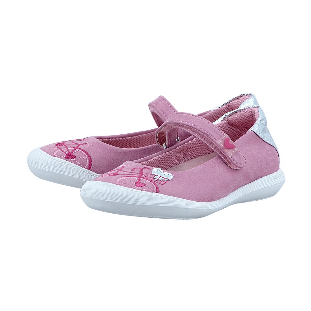 Παιδικές μπαρέτες σε ροζ μεταλλιζέ χρώμα με σχέδιο ποδήλατο και ασημί λεπτομέρειες.Τεχνόδερμα εξωτερικά και εσωτερικά επένδυση ύφασμα,με δερμάτινο,ανατομικό,αποσπώμενο πάτο.Το πέλμα είναι αντιμυκητιακό και αντιμικροβιακό και η σόλα μαλακή και αντιολισθητική.Κλείσιμο με λουράκι με αυτοκόλλητο.