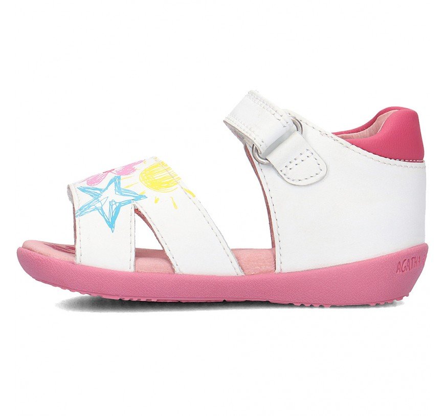 Παιδικά δερμάτινα παπουτσοπέδιλα σε λευκό χρώμα με πολύχρωμες λεπτομέρειες στο μπροστινό μέρος.Δερμάτινα εξωτερικά και εσωτερικά,με δερμάτινο,ανατομικό πάτο.Το πέλμα είναι αντιμυκητιακό και αντιμικροβιακό και η σόλα μαλακή και αντιολισθητική.Κλείσιμο με αυτοκόλλητο σε δύο σημεία για εύκολη εφαρμογή.