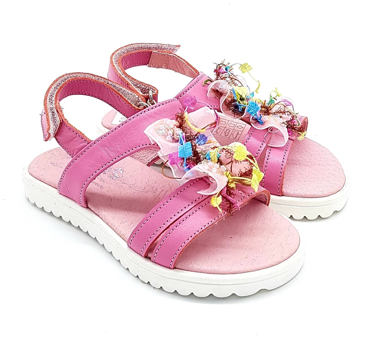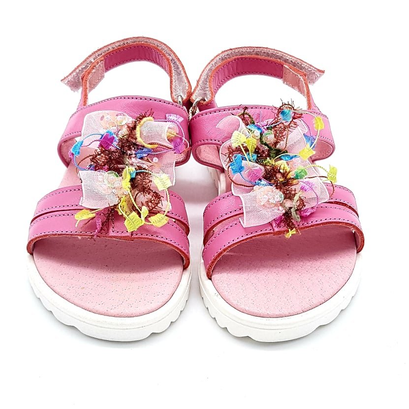Παιδικά δερμάτινα πέδιλα, σε ροζ/φούξια χρώμα, με χρωματιστές λεπτομέρειες&τούλι.