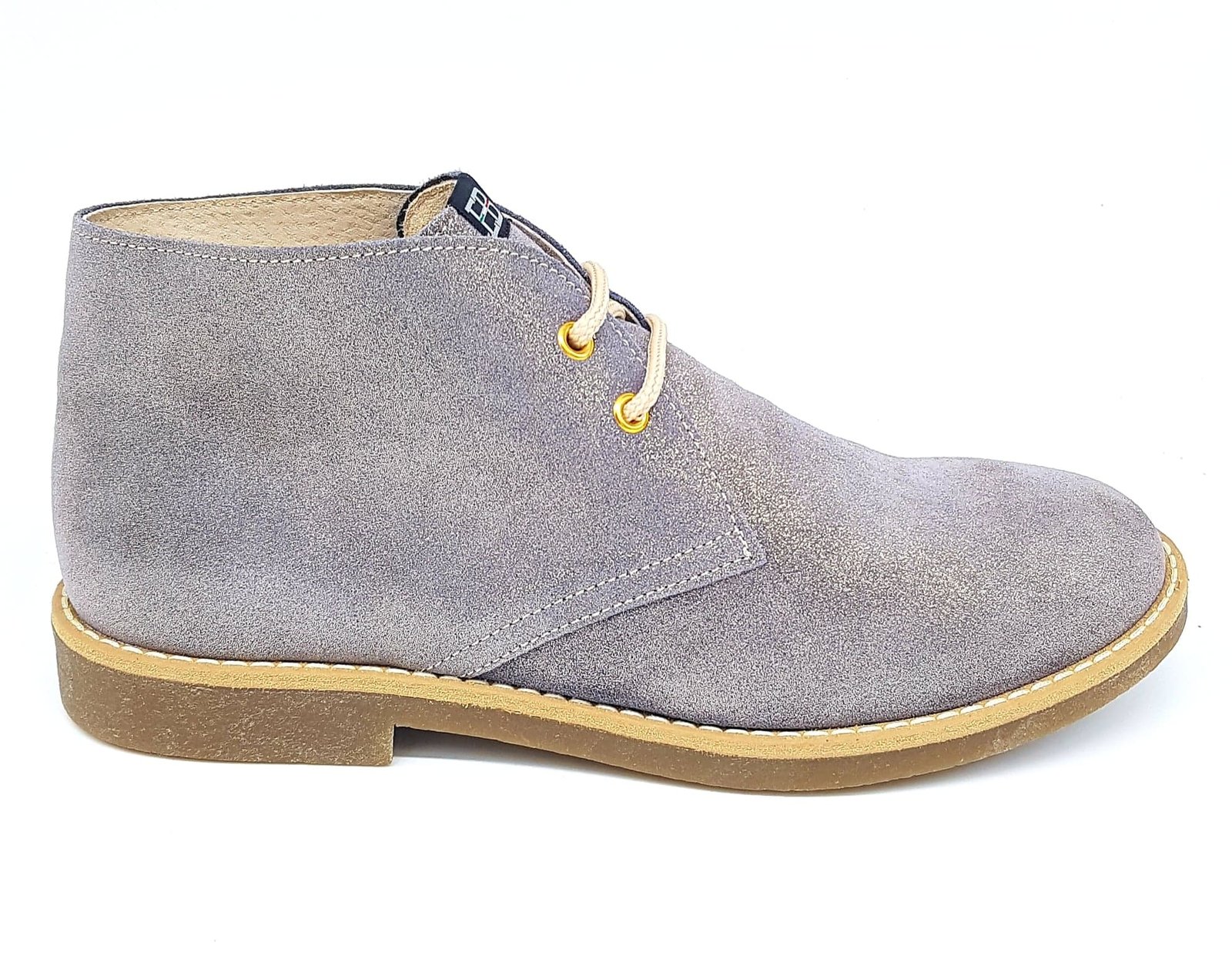 Παιδικά δερμάτινα κοριτσίστικα μποτάκια,σε ιριδίζον γκρι/χρυσό χρώμα,με μπεζ κορδόνια&σόλα.