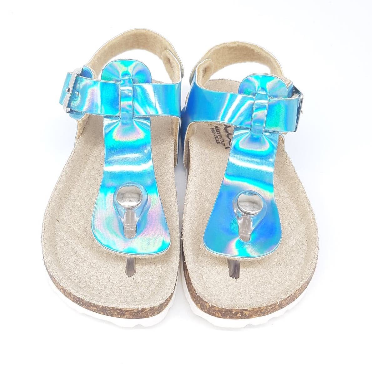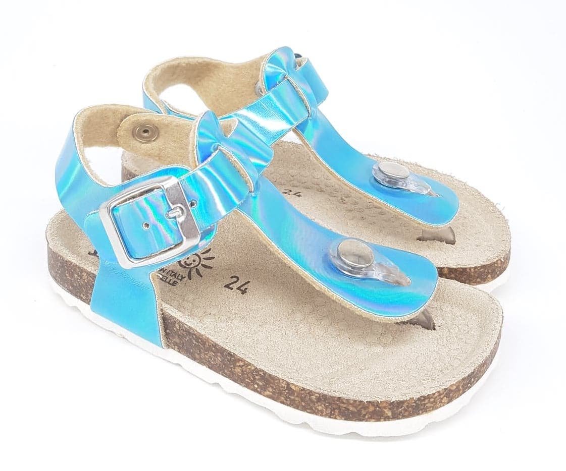 Παιδικά κοριτσίστικα πέδιλα,σε στυλ σκαφάκι,σε γαλάζιο ιριδίζον χρώμα.