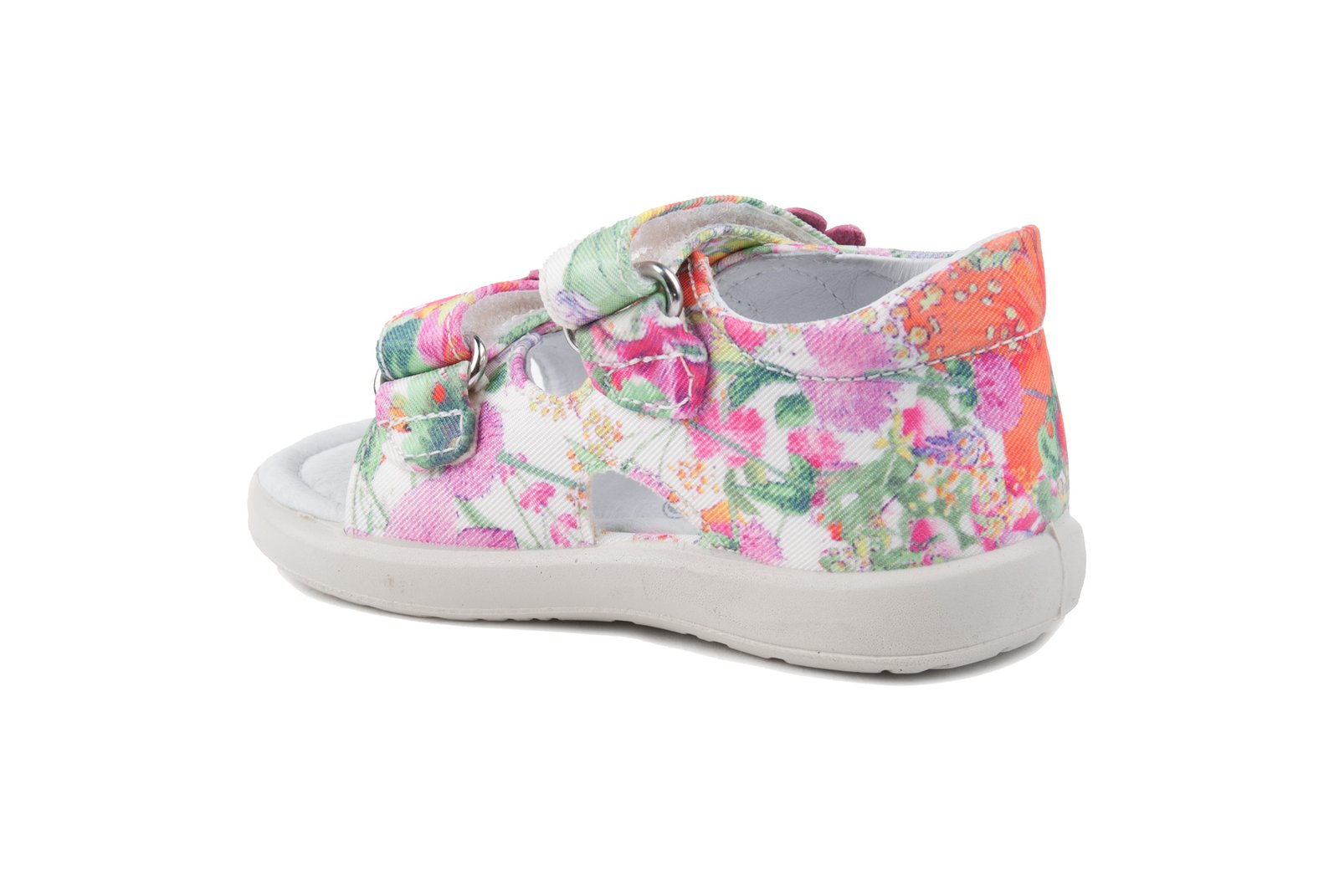 Παιδικά δερμάτινα παπουτσοπέδιλα σε λευκό χρώμα,με πολύχρωμο λουλουδάτο σχέδιο.Ύφασμα εξωτερικά και εσωτερικά δερμάτινη επένδυση,με δερμάτινο,ανατομικό πάτο.Το πέλμα είναι αντιμικροβιακό και αντιμυκητιακό και η σόλα εύκαμπτη και μαλακή.Κλείσιμο με αυτοκόλλητο σε δύο σημεία.