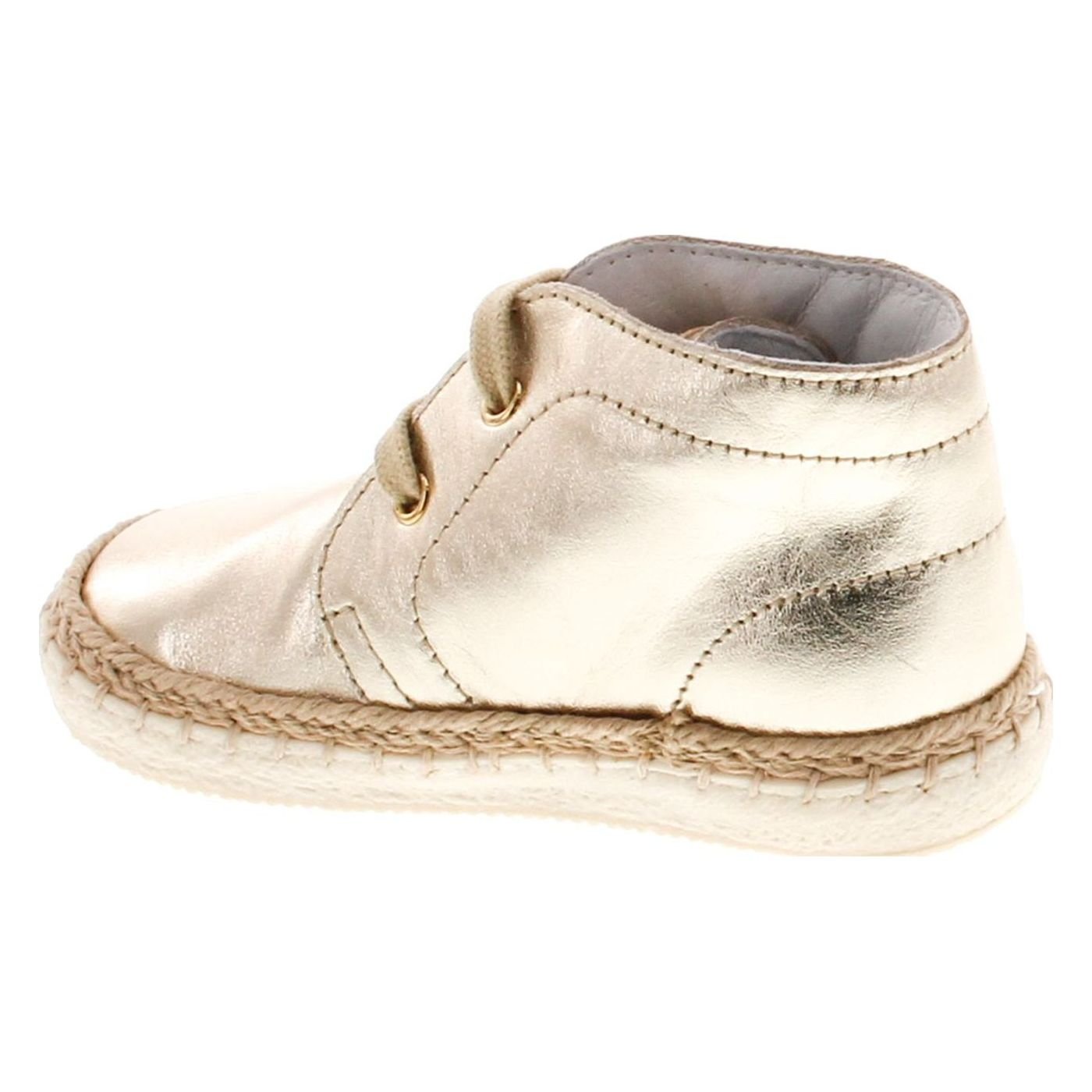 Παιδικά δερμάτινα μποτάκια σε χρυσό μεταλλιζέ χρώμα.Δερμάτινα εσωτερικά και εξωτερικά,με δερμάτινο,ανατομικό πάτο.Το πέλμα είναι αντιμικροβιακό και αντιμυκητιακό και η σόλα εύκαμπτη και μαλακή.Κλείσιμο με κορδόνι.Λεπτομέρεια καραβόσχοινο κατά μήκος της σόλας.