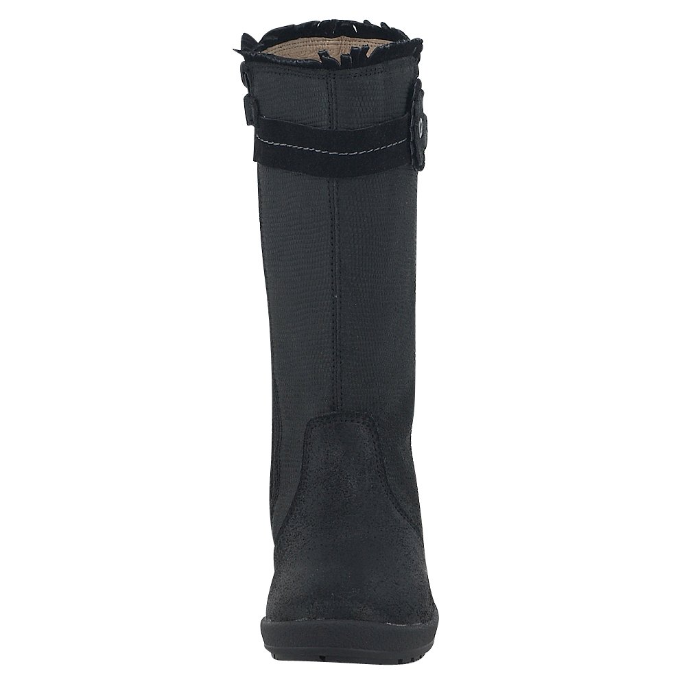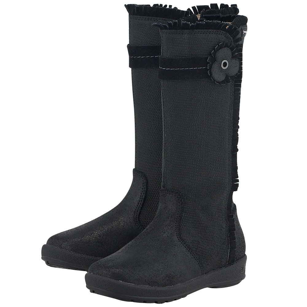 Παιδικές μπότες σε μαύρο χρώμα με σχέδιο ξέφτια κατά μήκος της ραφής.Δερμάτινες εξωτερικά και εσωτερικά επένδυση φλις,με δερμάτινο ανατομικό αποσπώμενο πάτο.Το πέλμα είναι αντιμικροβιακό και αντιμυκητιακό,και η σόλα μαλακή και εύκαμπτη.Κλείσιμο με φερμουάρ και velcro για εύκολη εφαρμογή.