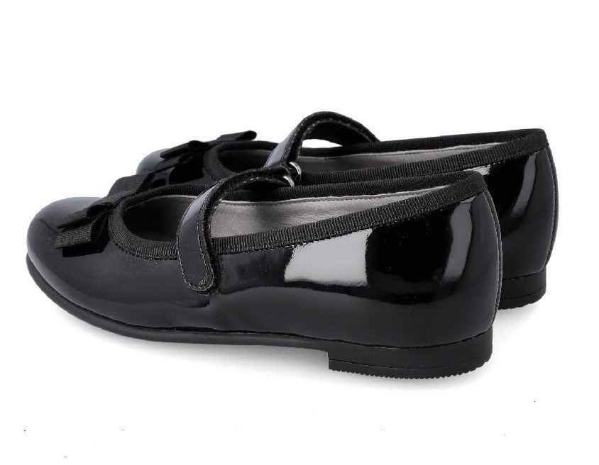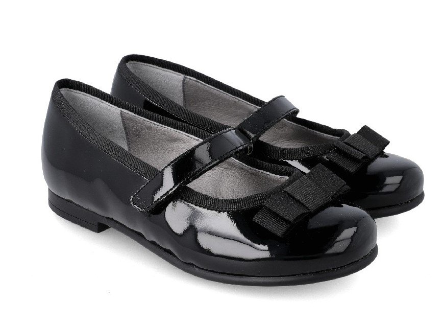 Παιδικές δερμάτινες μπαρέτες σε μαύρο λουστρίνι με φιόγκο στη μύτη.