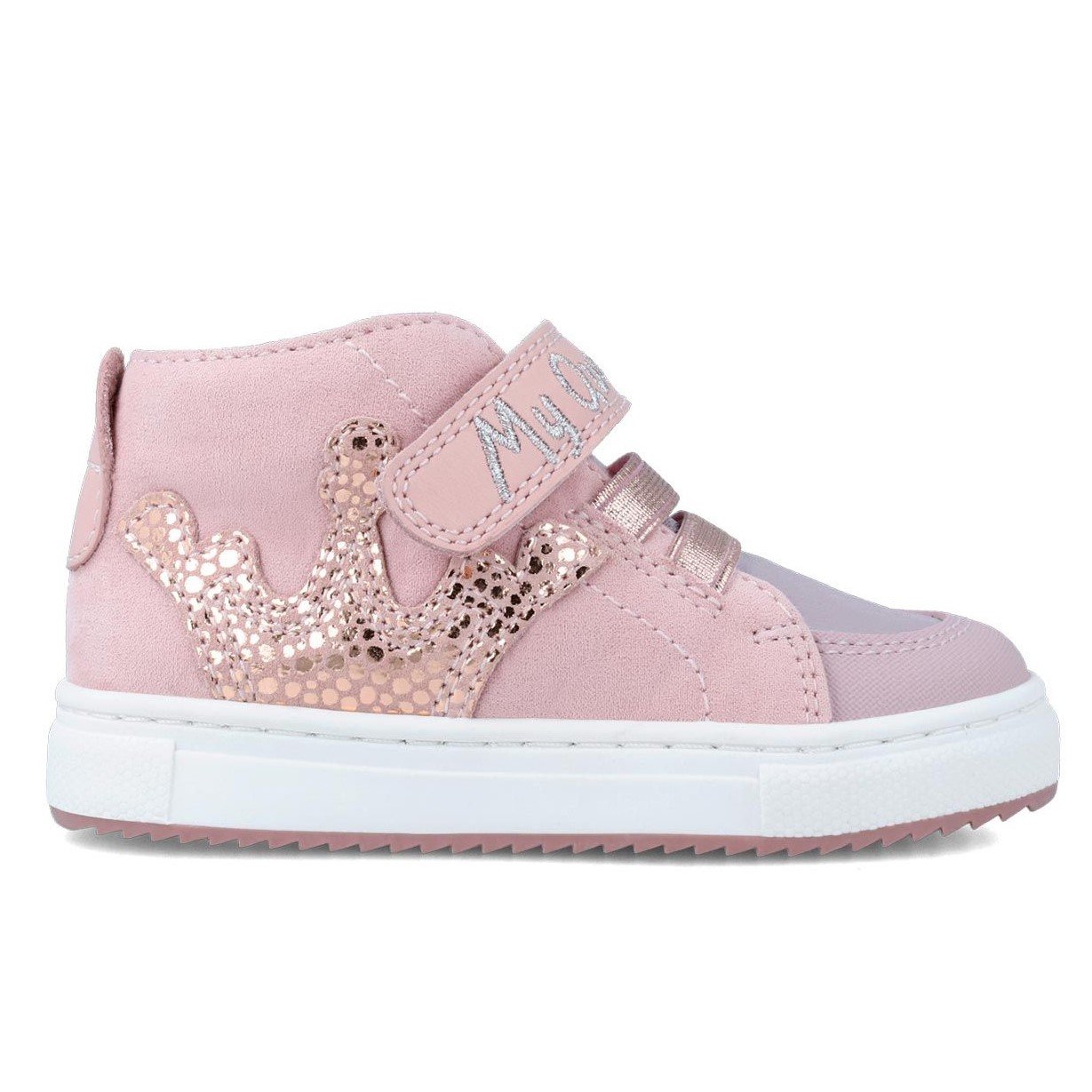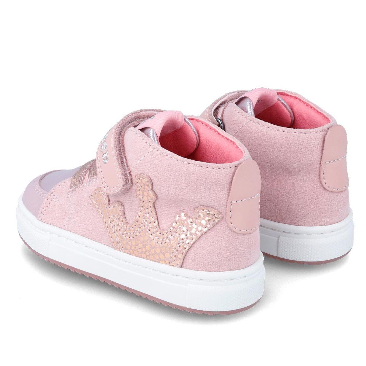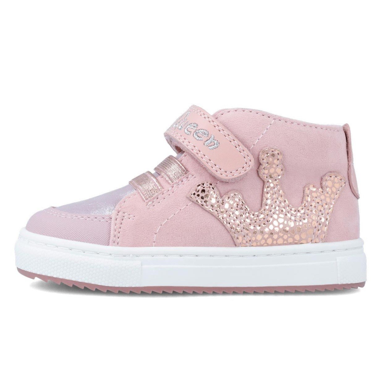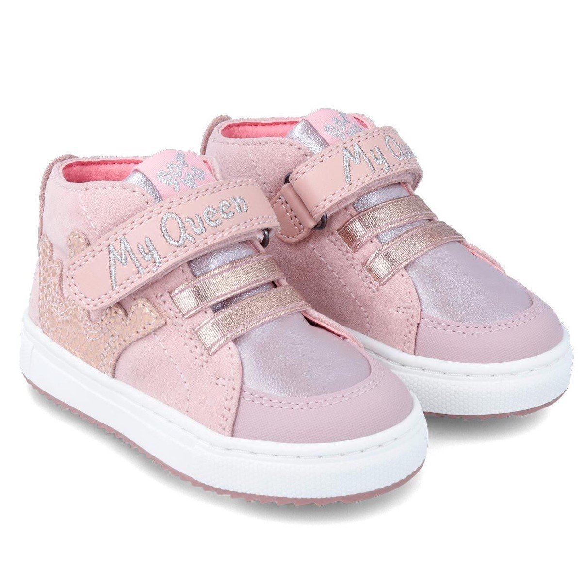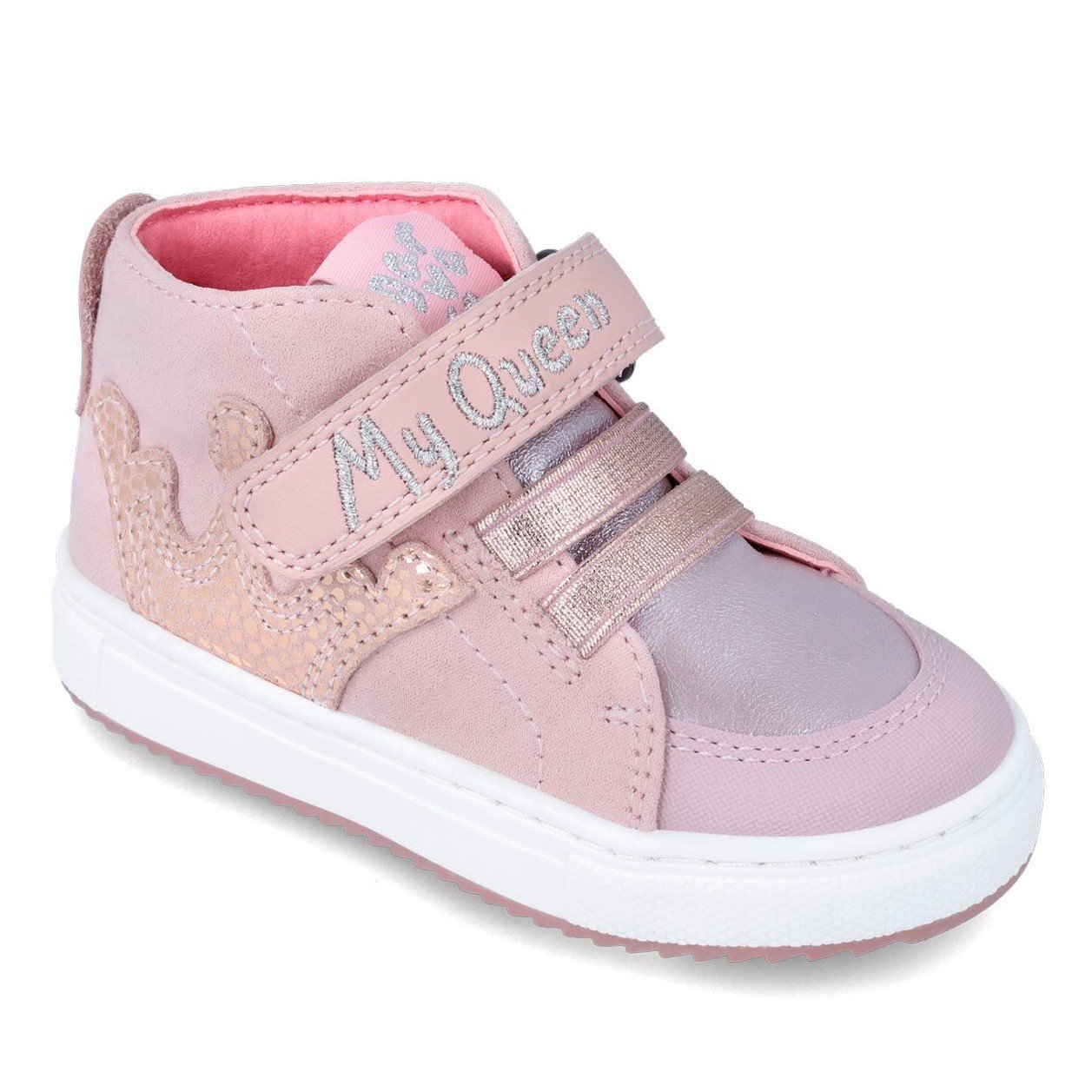 Παιδικά μποτάκια σε ροζ χρώμα, με λιλά λεπτομέρειες, σχέδιο κορώνα στο πλάι & My Queen στο αυτοκόλλητο.