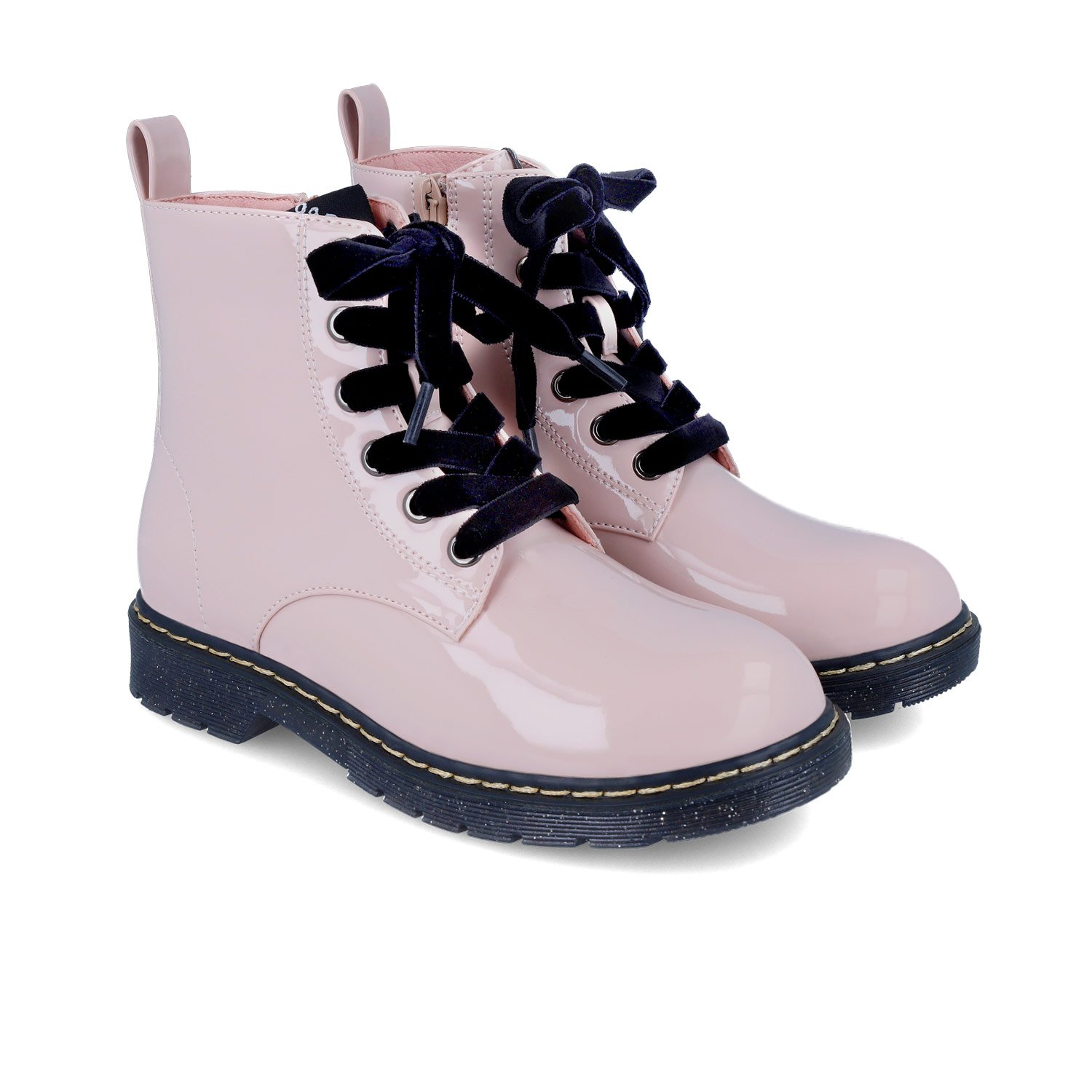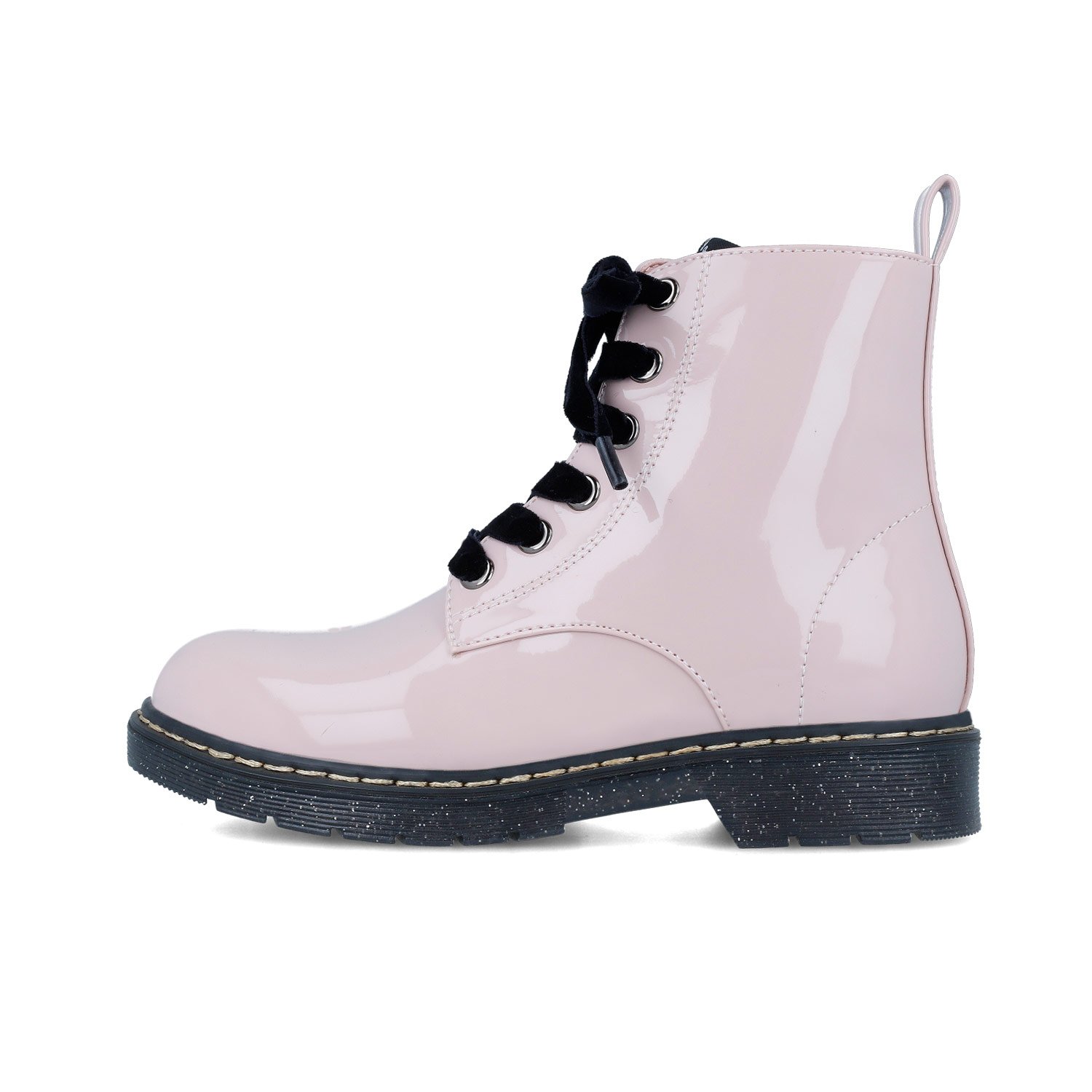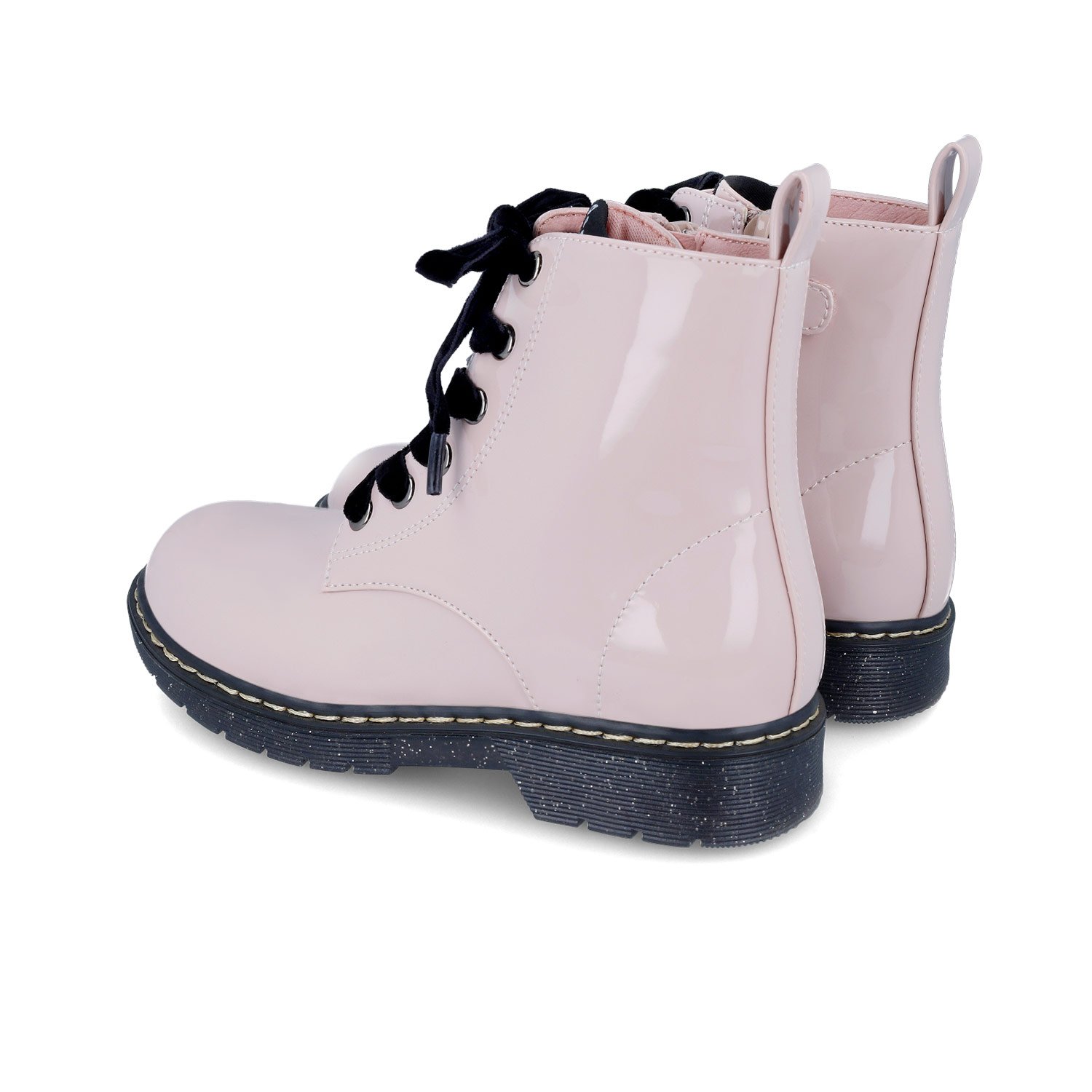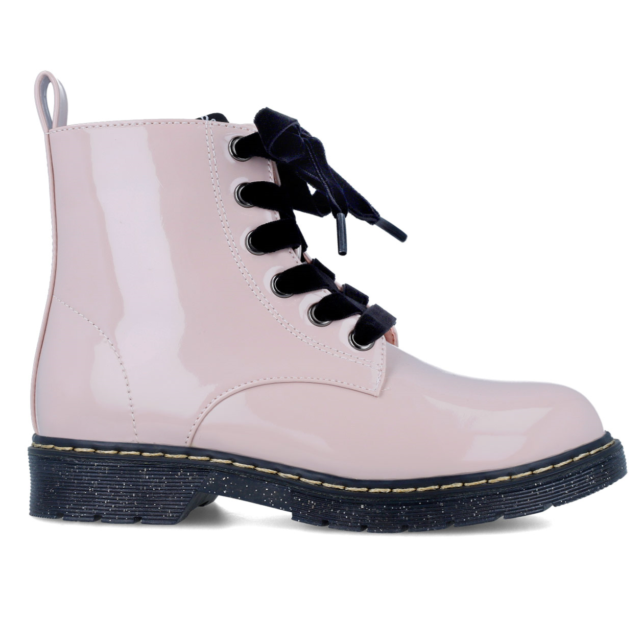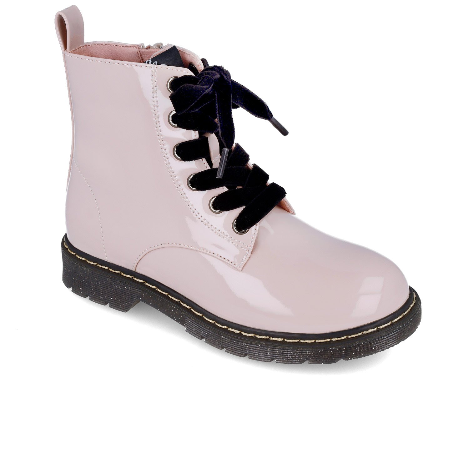 Παιδικά μποτάκια, στυλ αρβυλάκια σε ροζ λουστρίνι χρώμα με μαύρα βελούδινα κορδόνια & glitter σόλα.