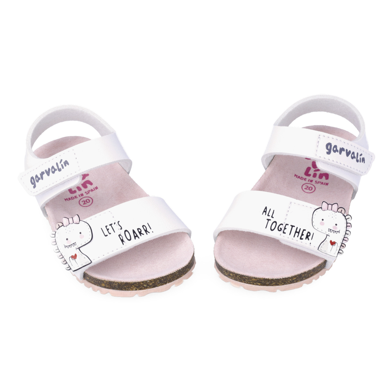 Παιδικά πέδιλα με ανατομικό πέλμα, τύπου σκαφάκι, σε λευκό χρώμα με TWIN σχέδιο δεινοσαυράκι κορίτσι ''Let's Roarr! - All together!''.