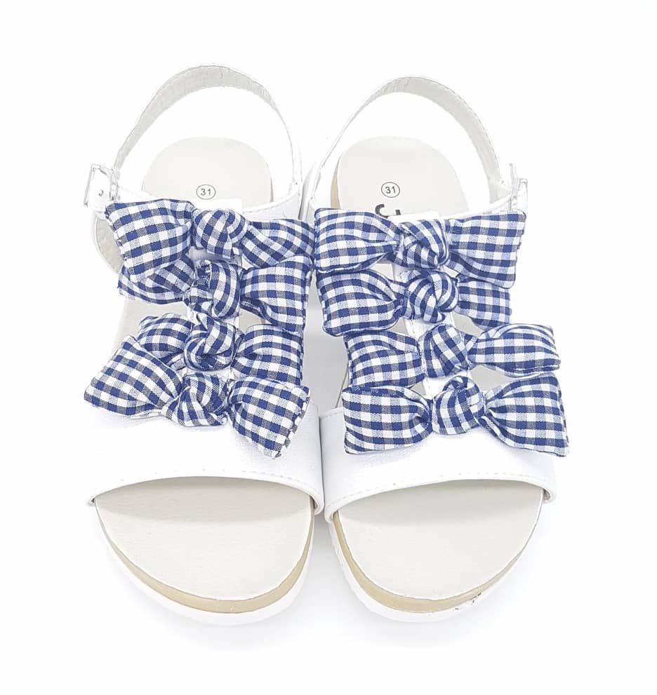 Παιδικά κοριτσίστικα πέδιλα σε ιριδίζον λευκό χρώμα με σχέδιο μπλε καρό φιογκάκια.