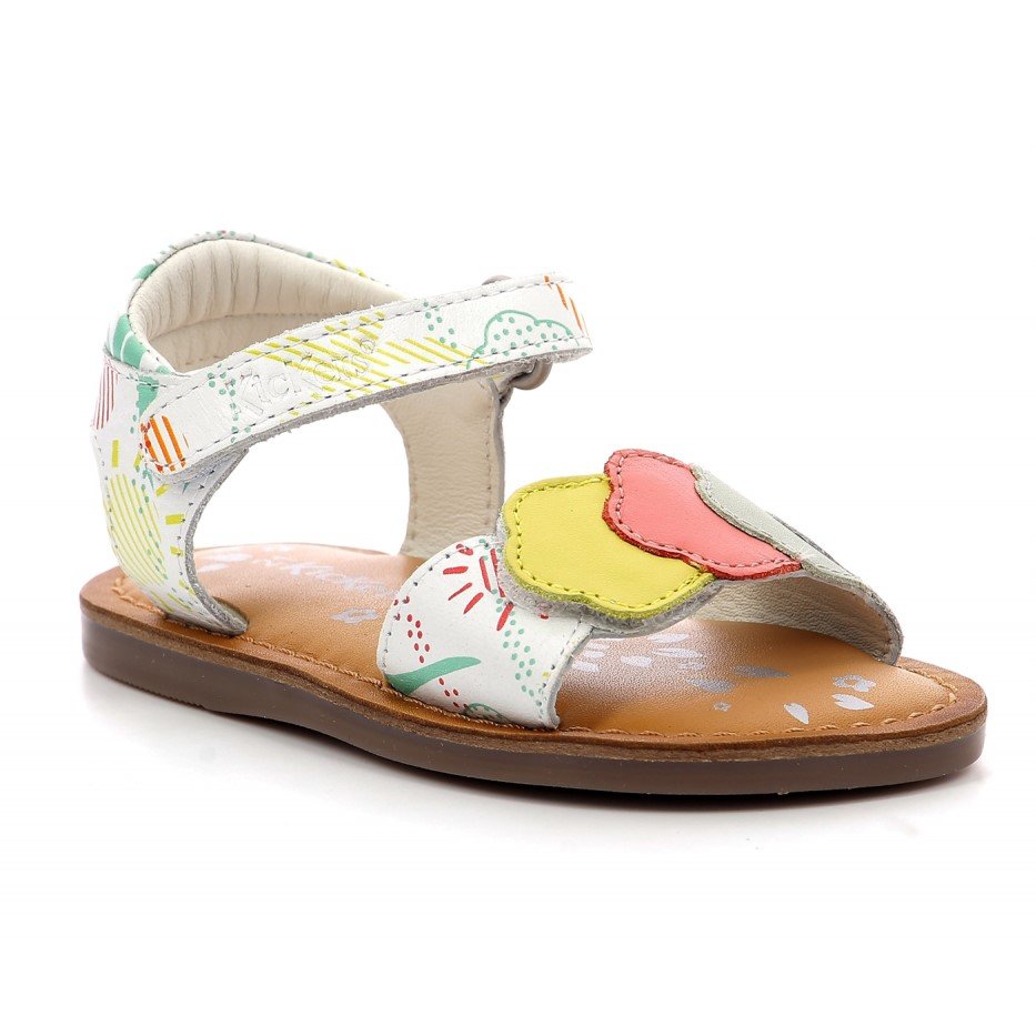 Παιδικά δερμάτινα πέδιλα, σε λευκό χρώμα, με πολύχρωμο καλοκαιρινό σχέδιο.