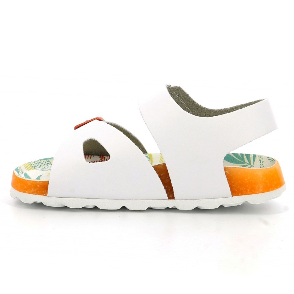 Παιδικά πέδιλα με ανατομικό πέλμα, τύπου σκαφάκι, σε λευκό χρώμα, με πορτοκαλί λεπτομέρειες & πολύχρωμο πέλμα.
