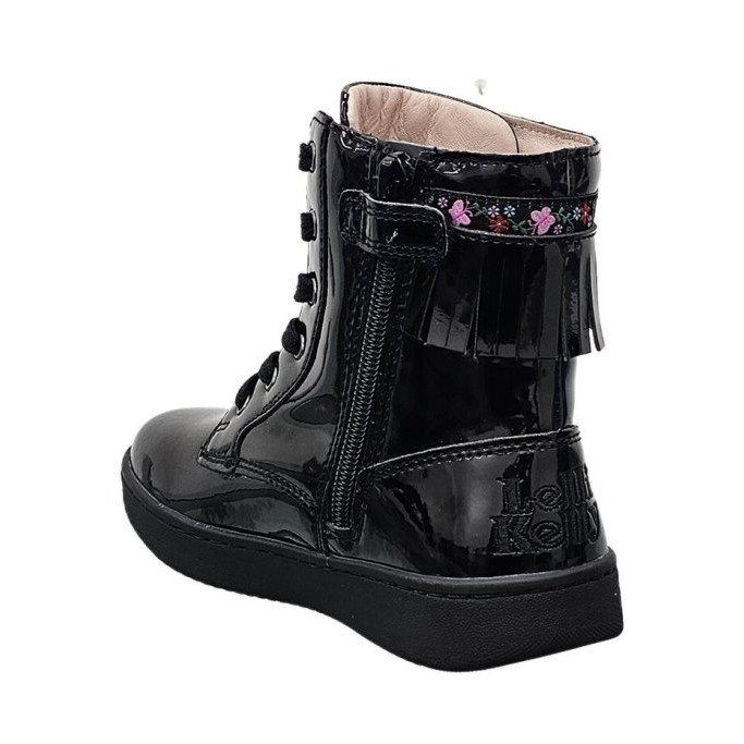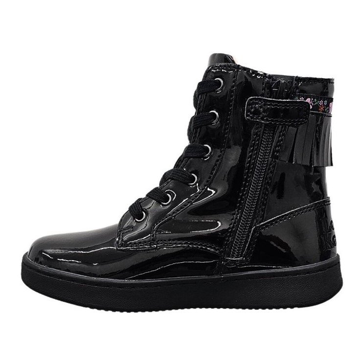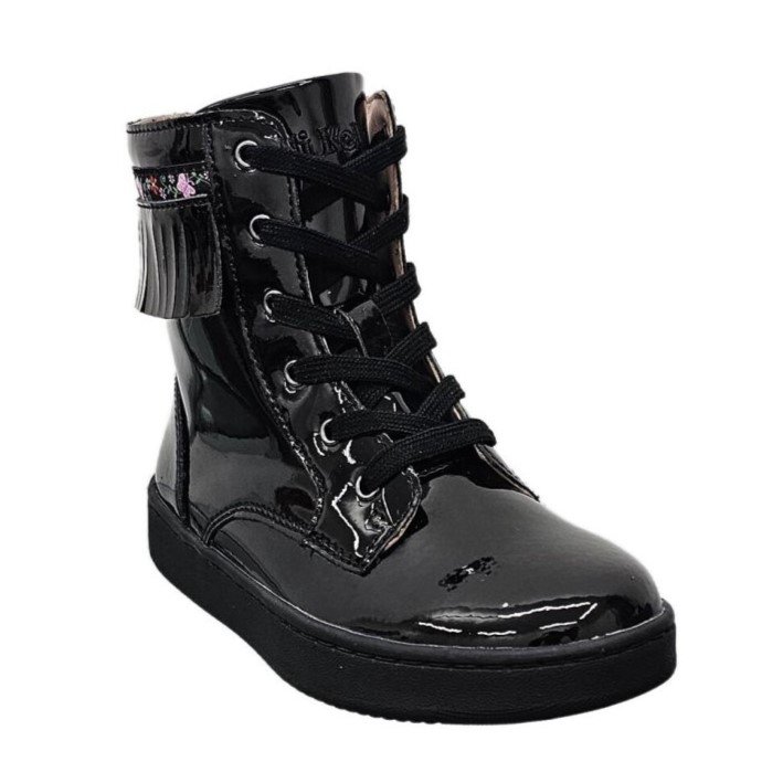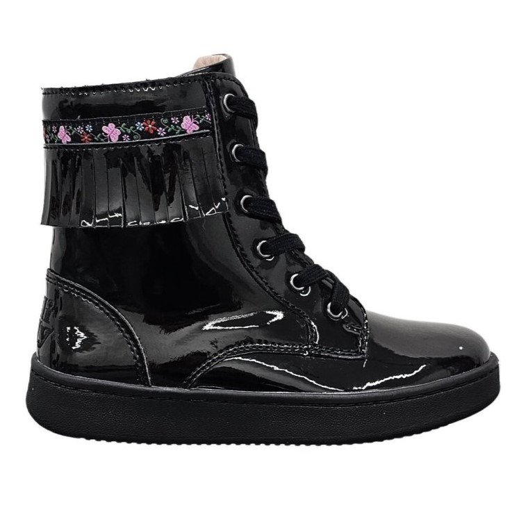 Κοριτσίστικο ψηλό μποτάκι, τύπου αρβυλάκι, σε μαύρο λουστρίνι χρώμα με σχέδιο κρόσσια στον αστράγαλο.