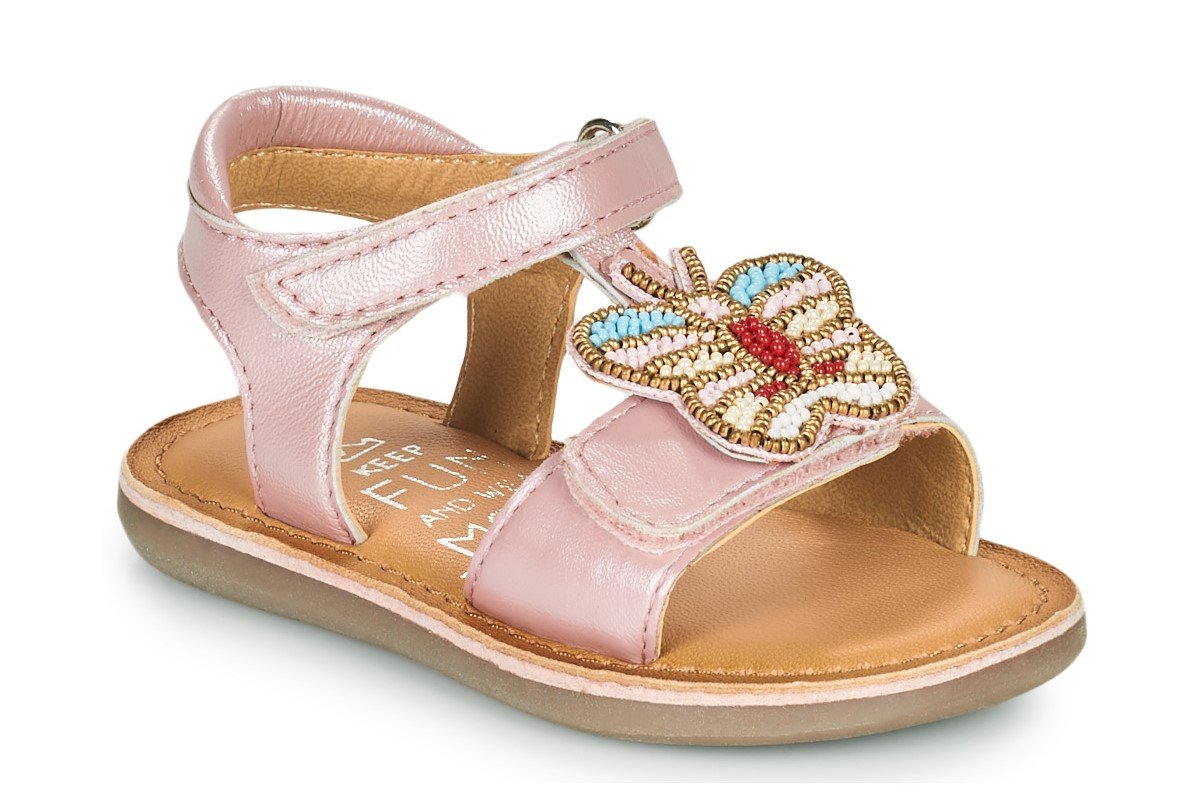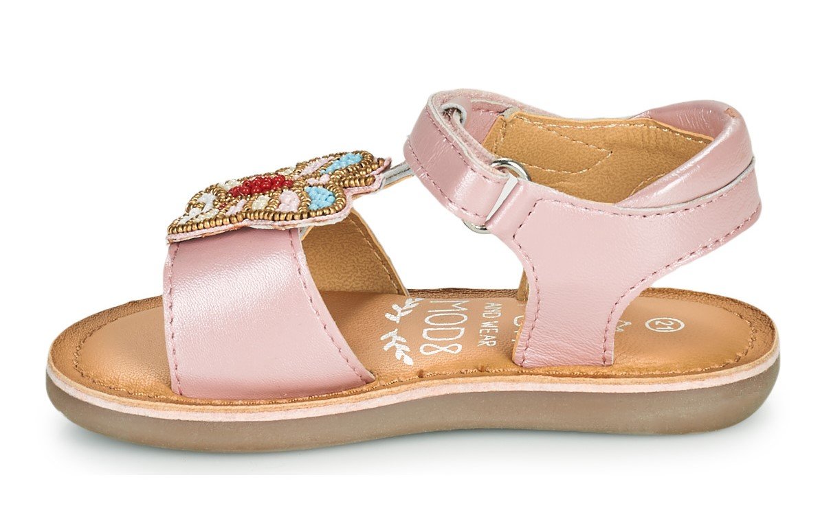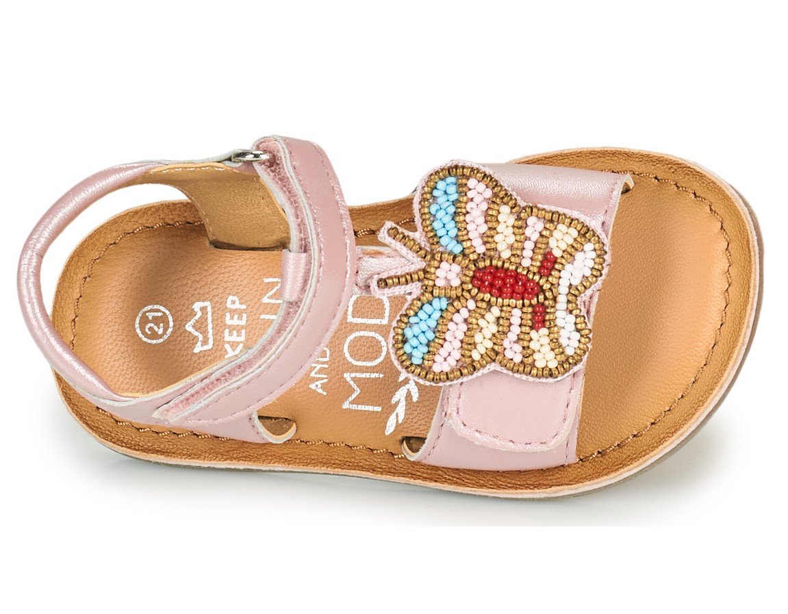 Παιδικά δερμάτινα πέδιλα σε μεταλλιζέ ροζ χρώμα με σχέδιο πεταλούδα από χάντρες.